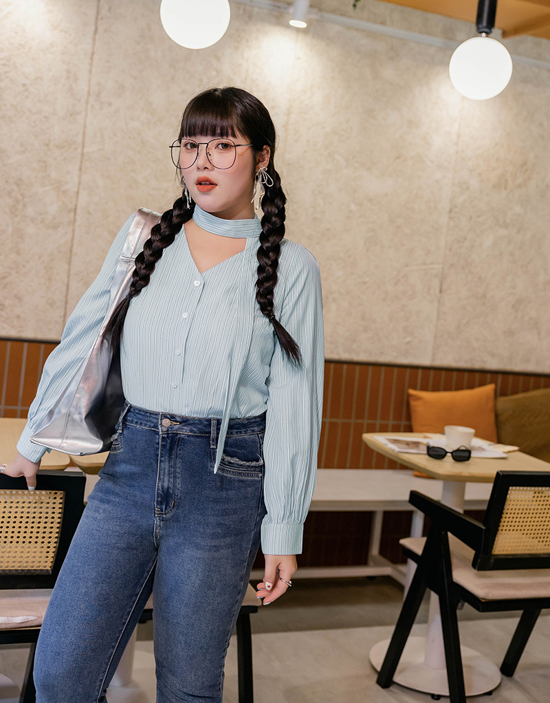 附領巾-V領排扣條紋襯衫