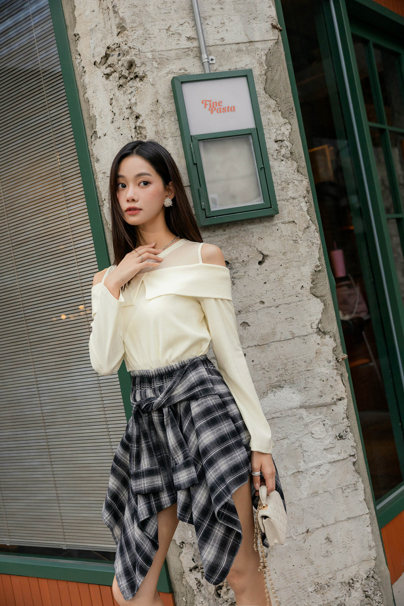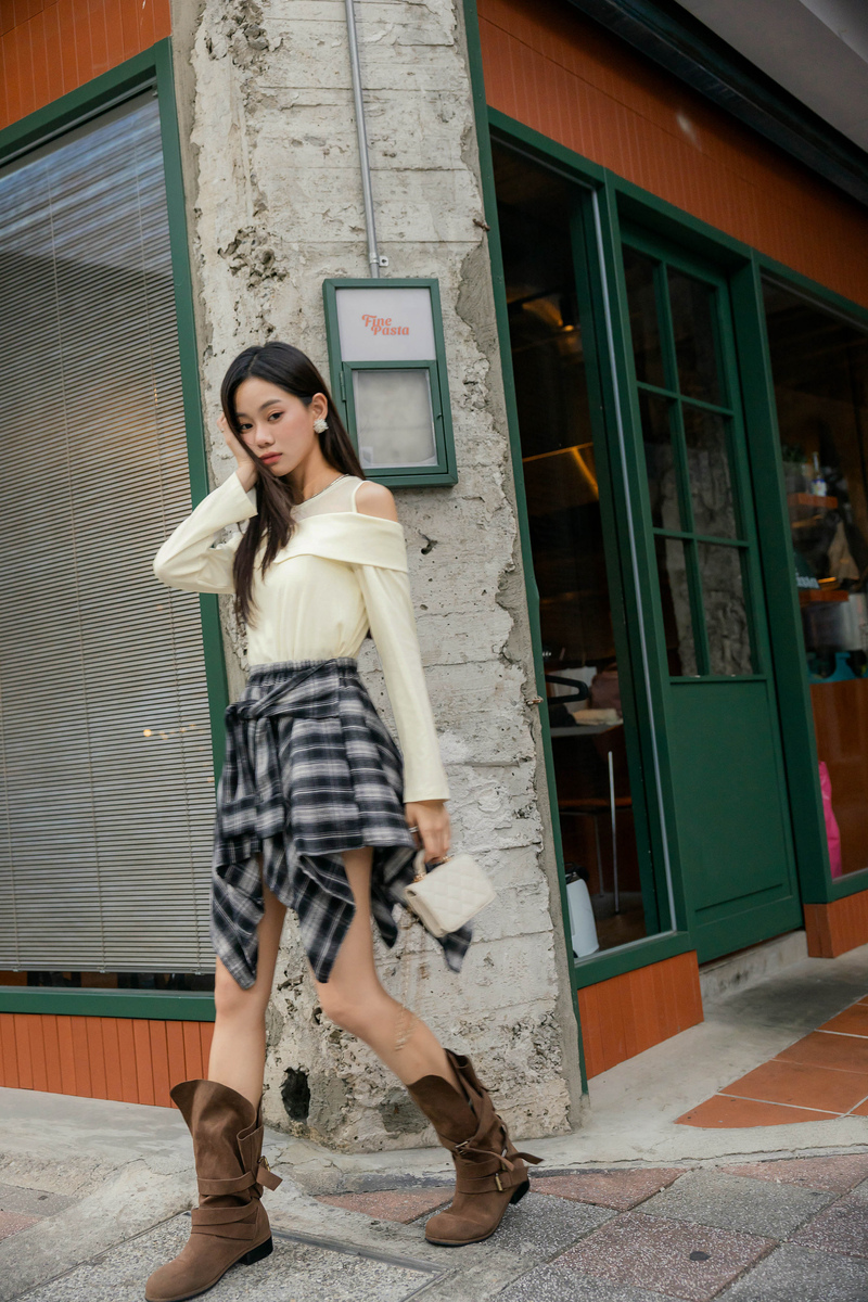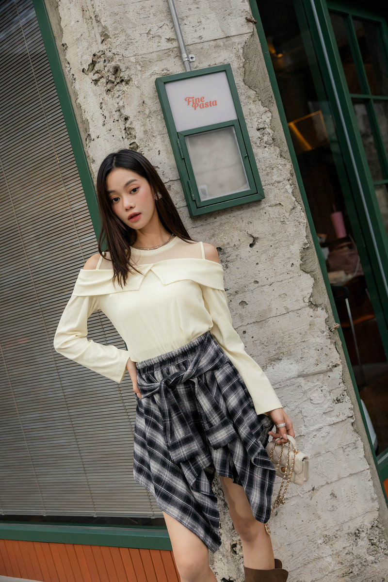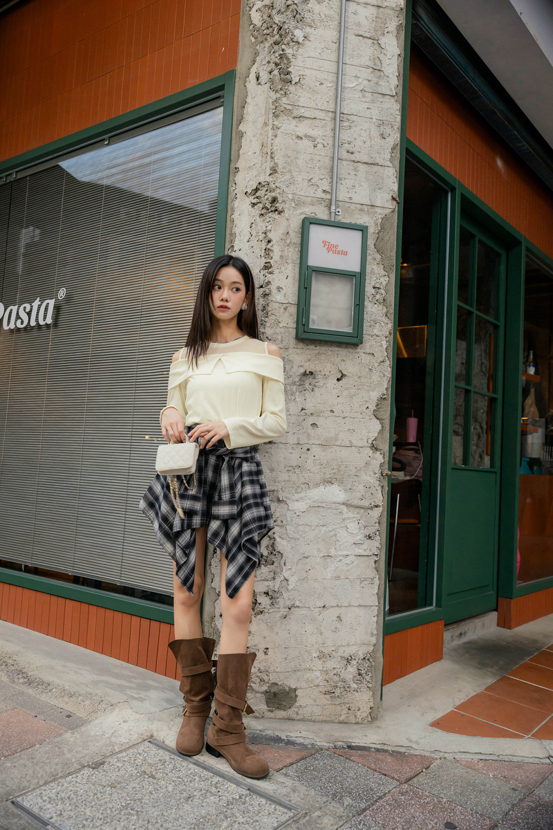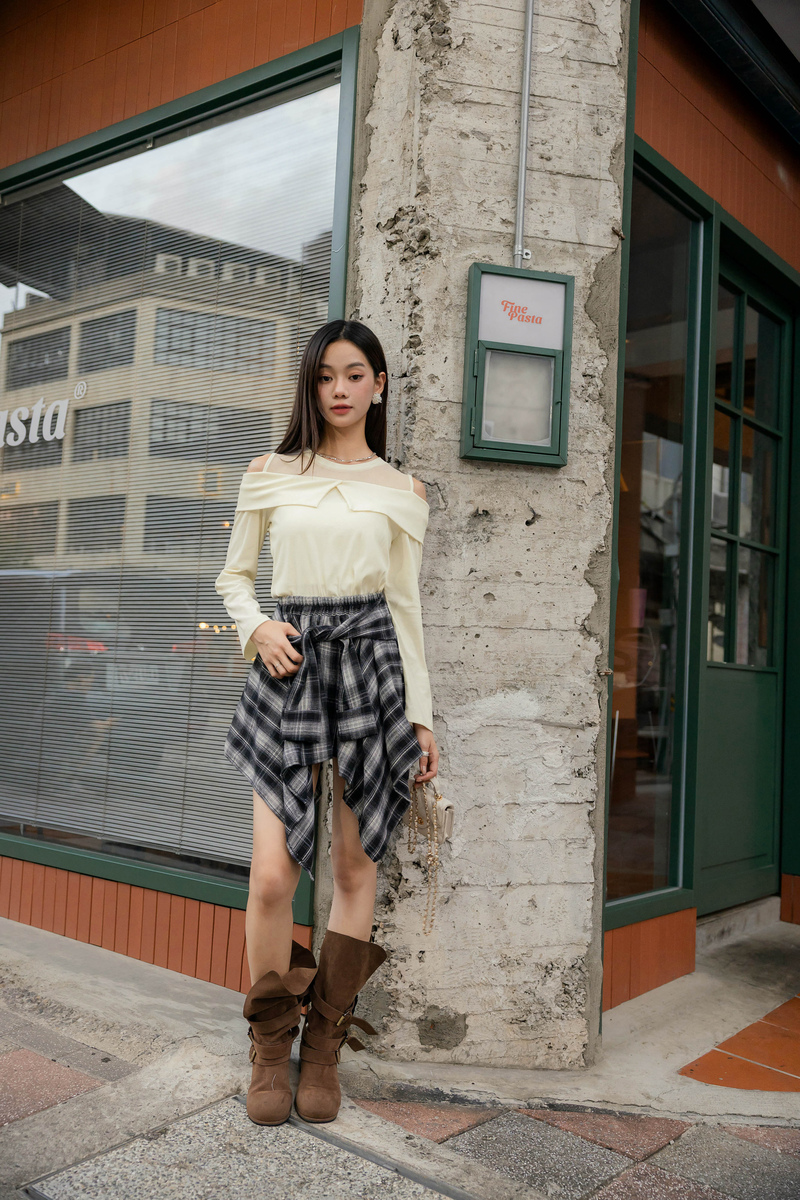 • 單肩綁帶薄針織上衣