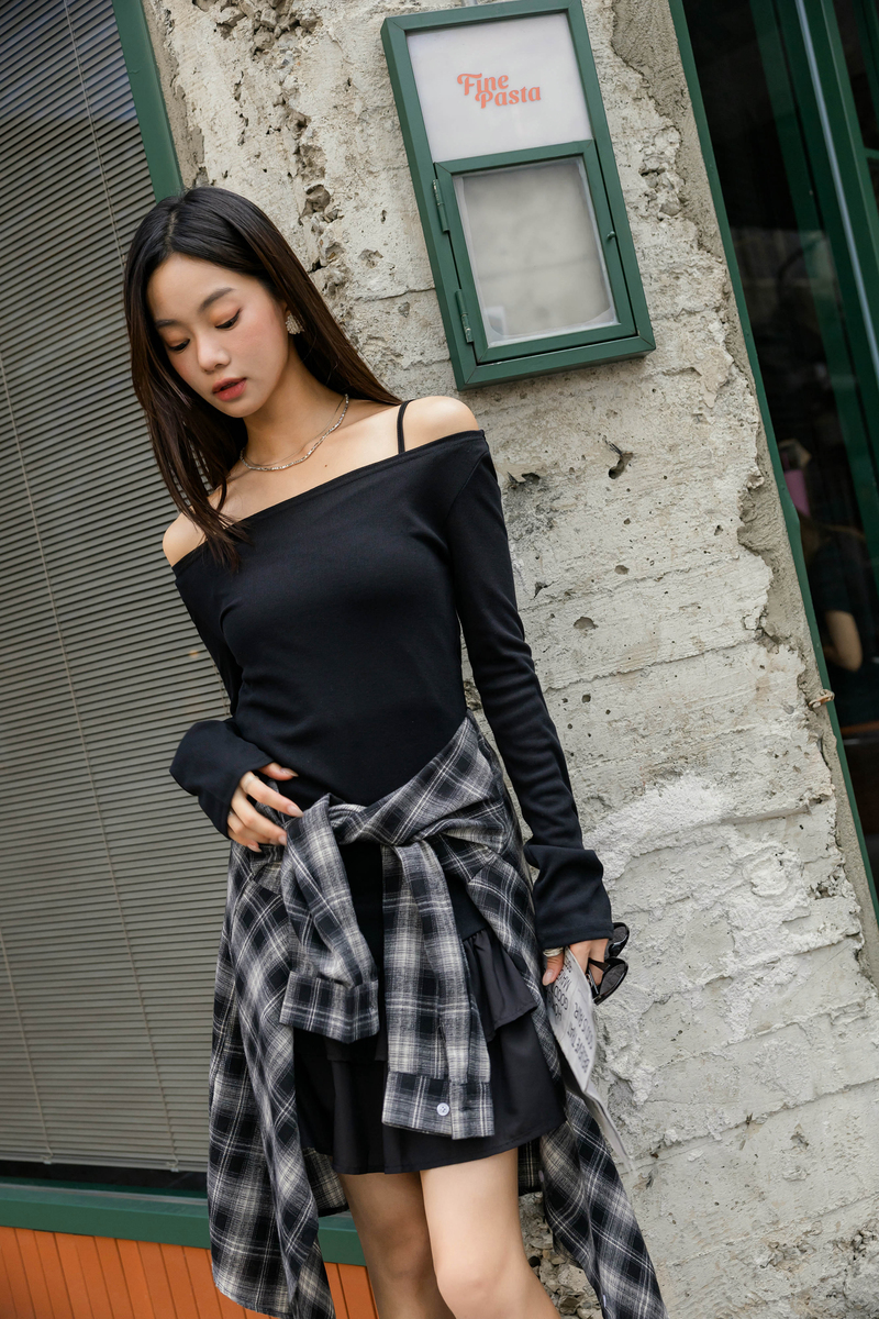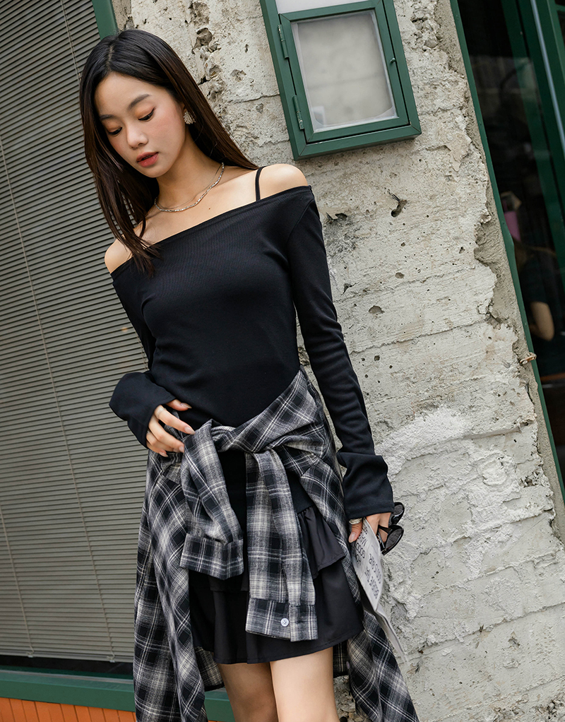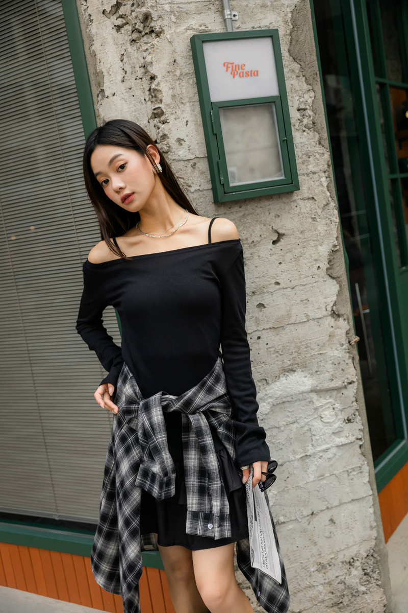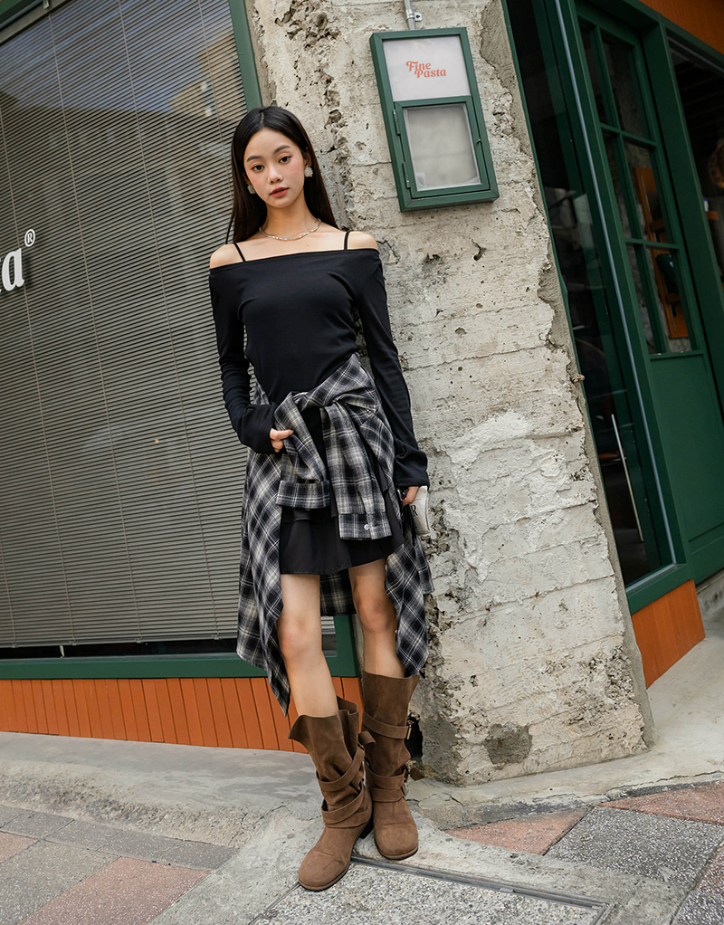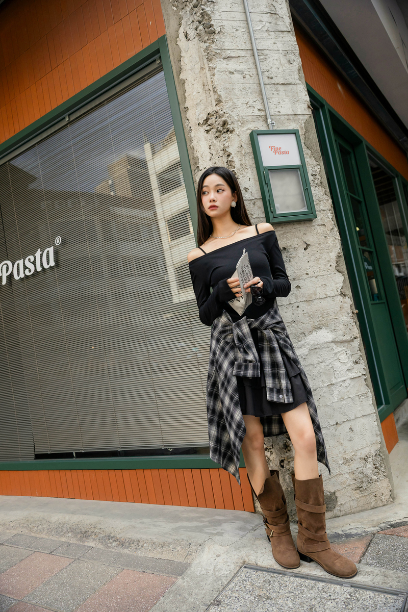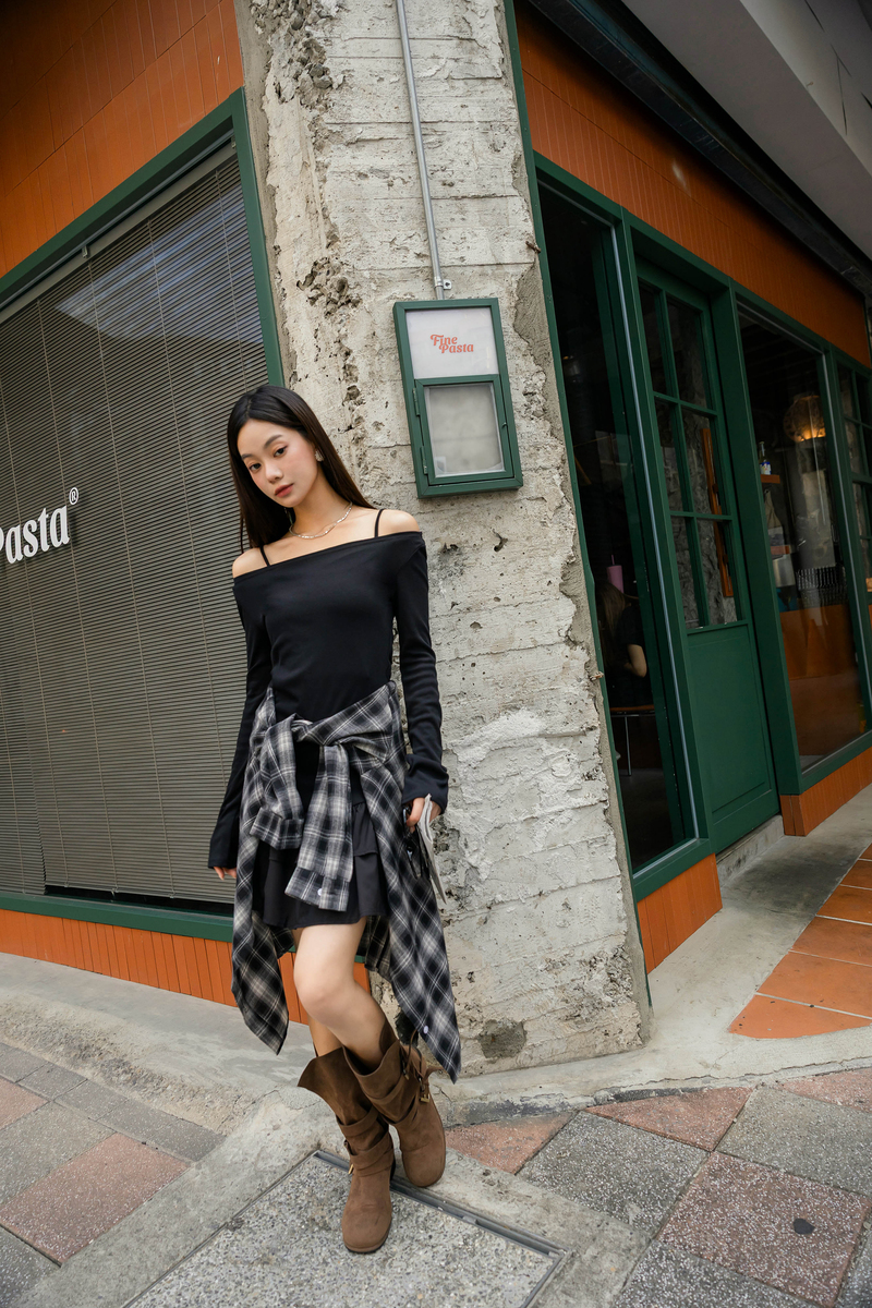• 兩件式-附綁帶磨毛格紋洋裝套組