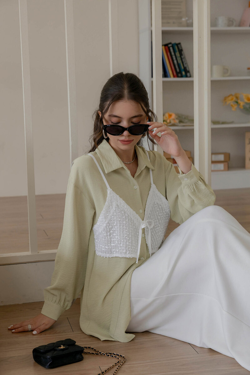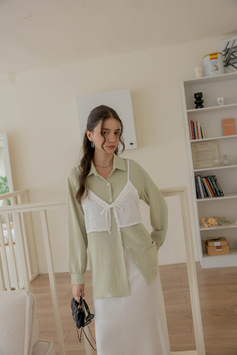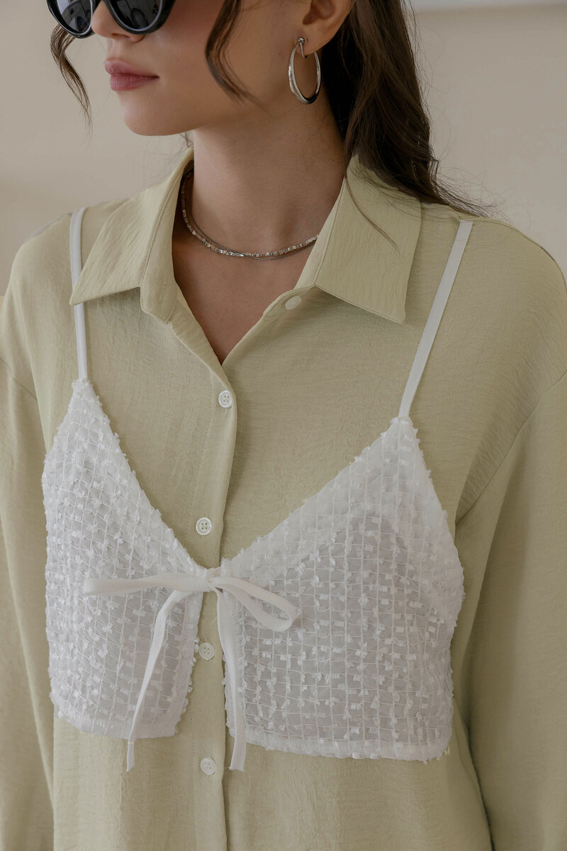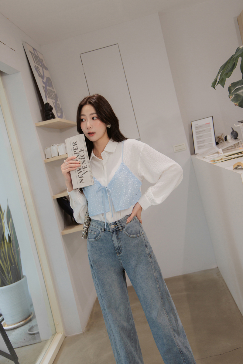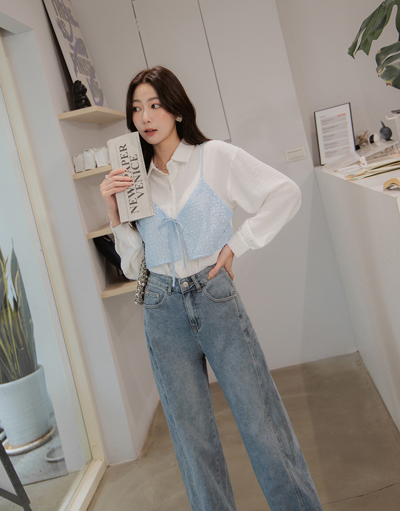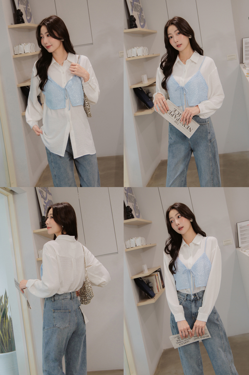 有型假兩件異材質綁帶襯衫