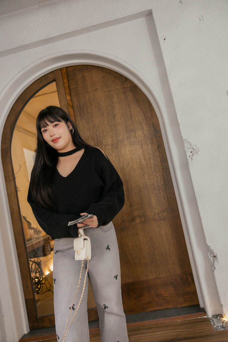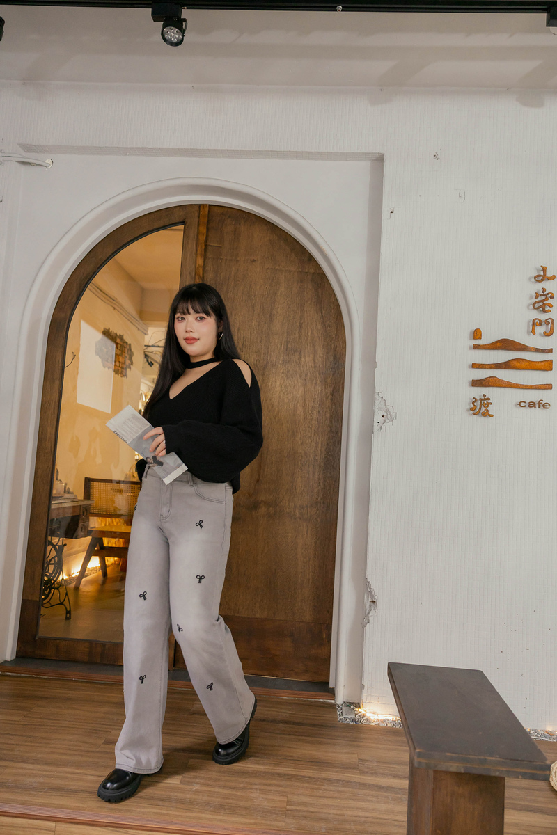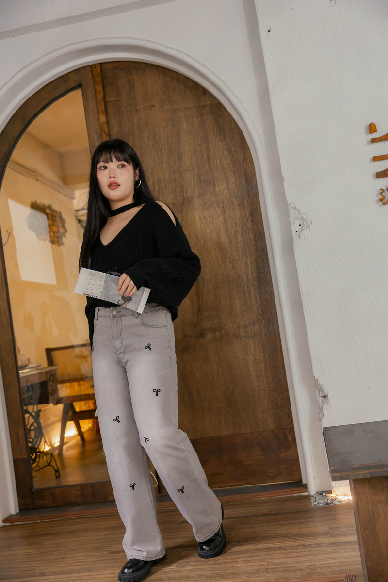 • -5公斤蝴蝶結刺繡水洗寬褲