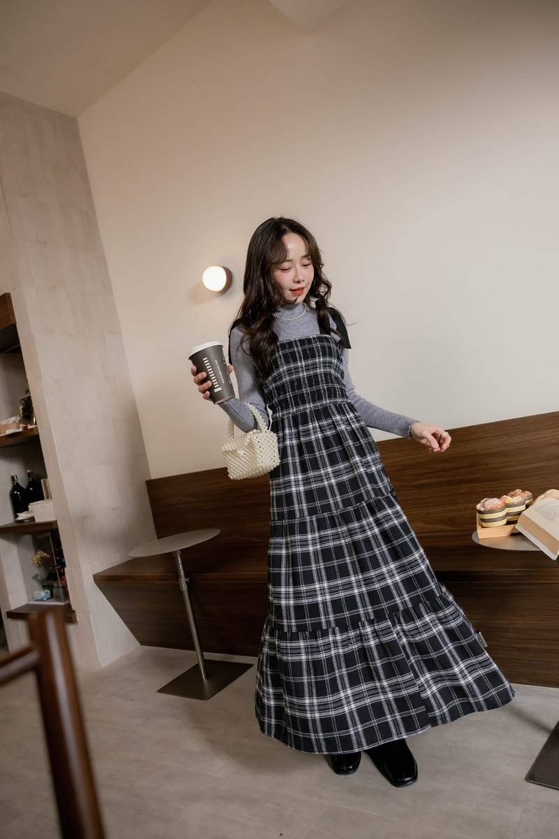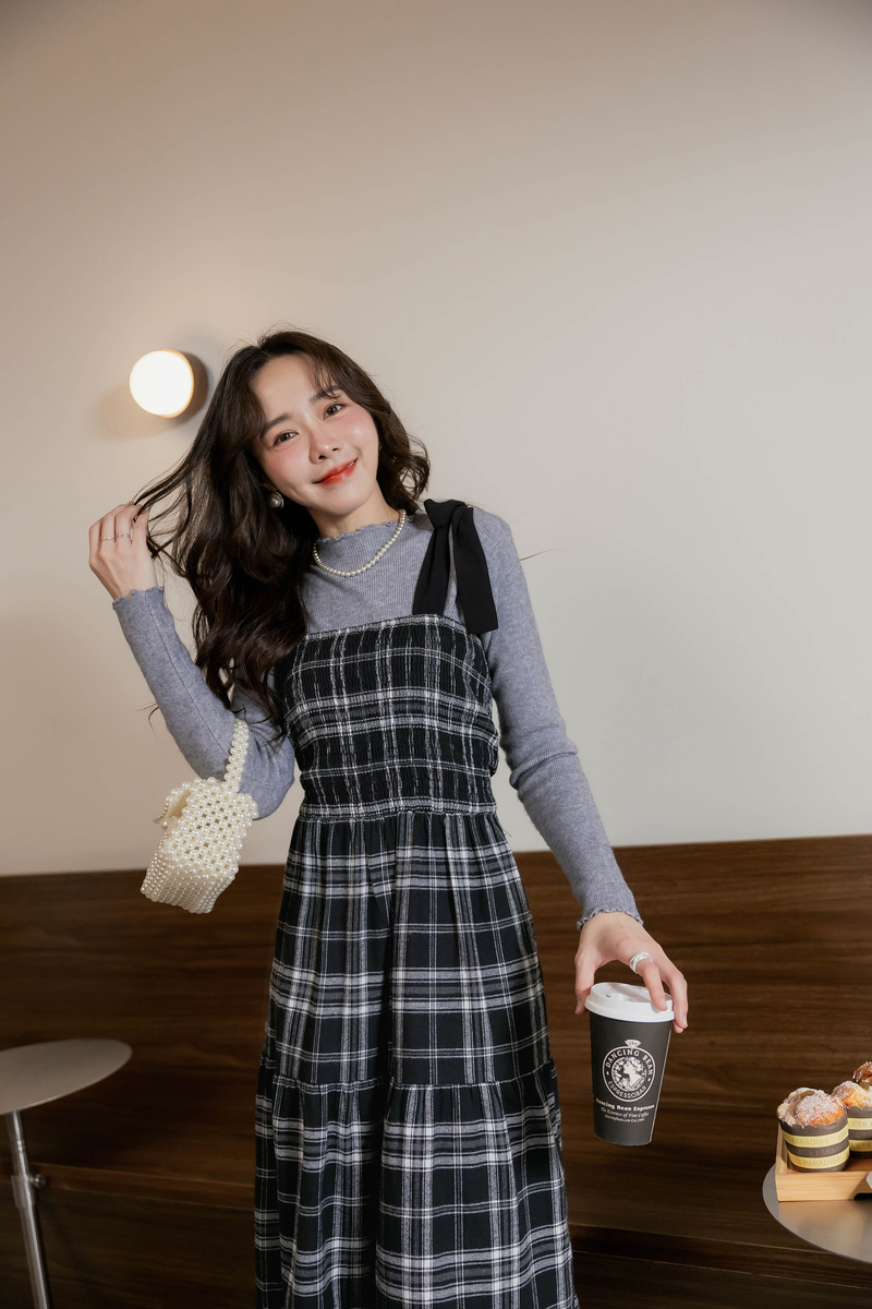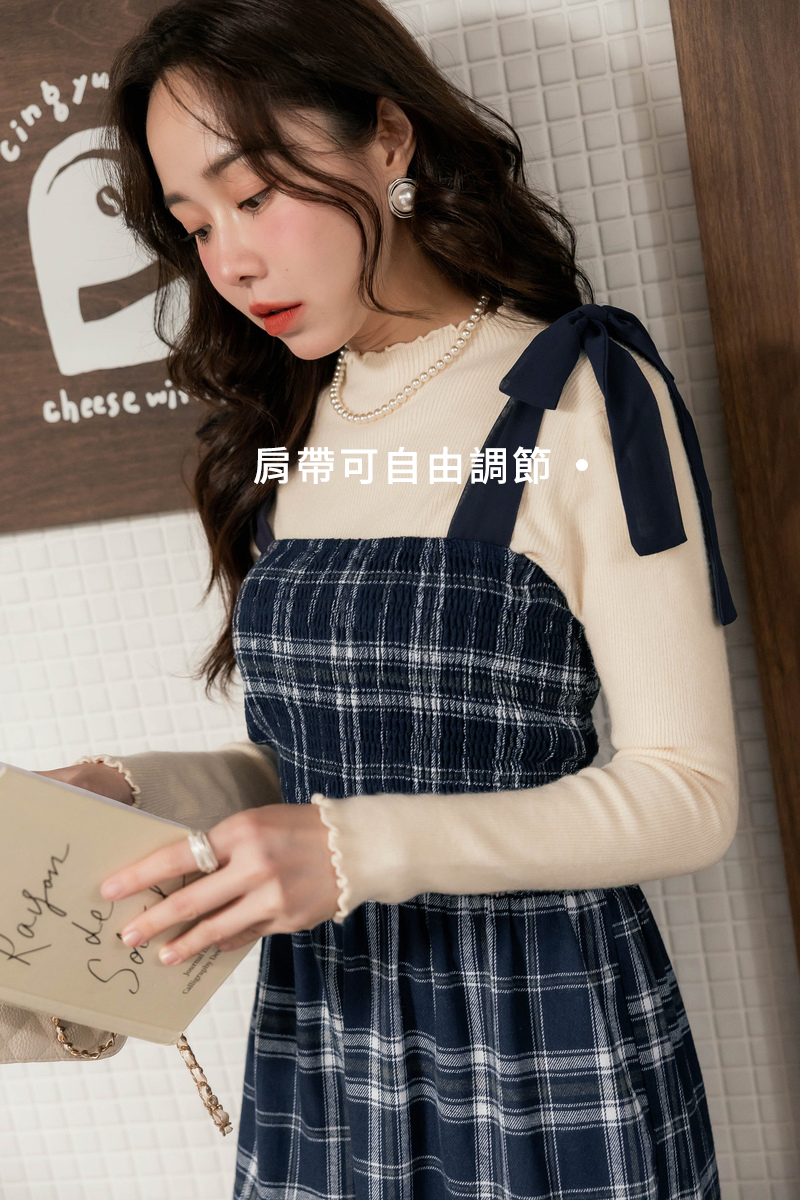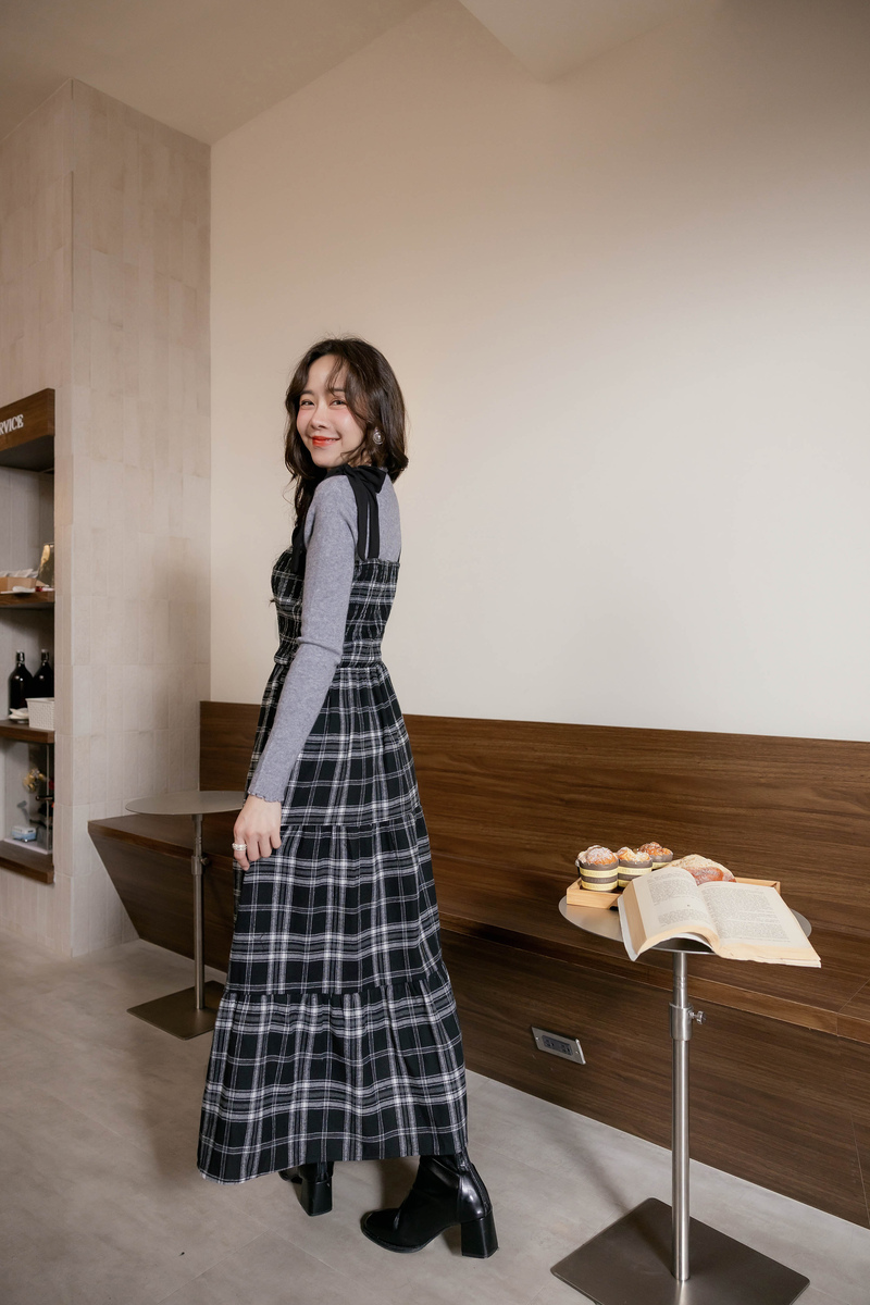 日系綁帶磨毛格紋蛋糕洋裝