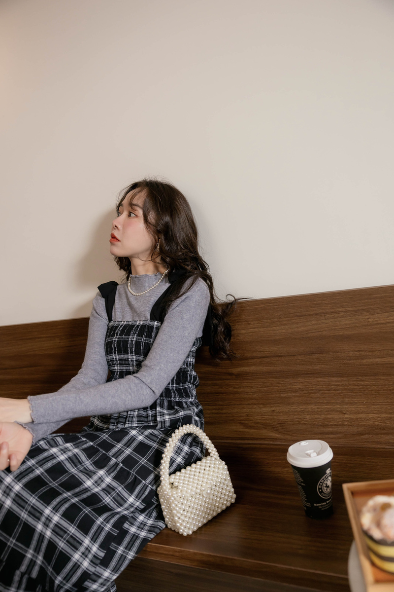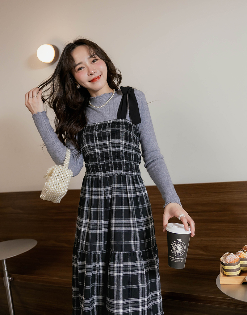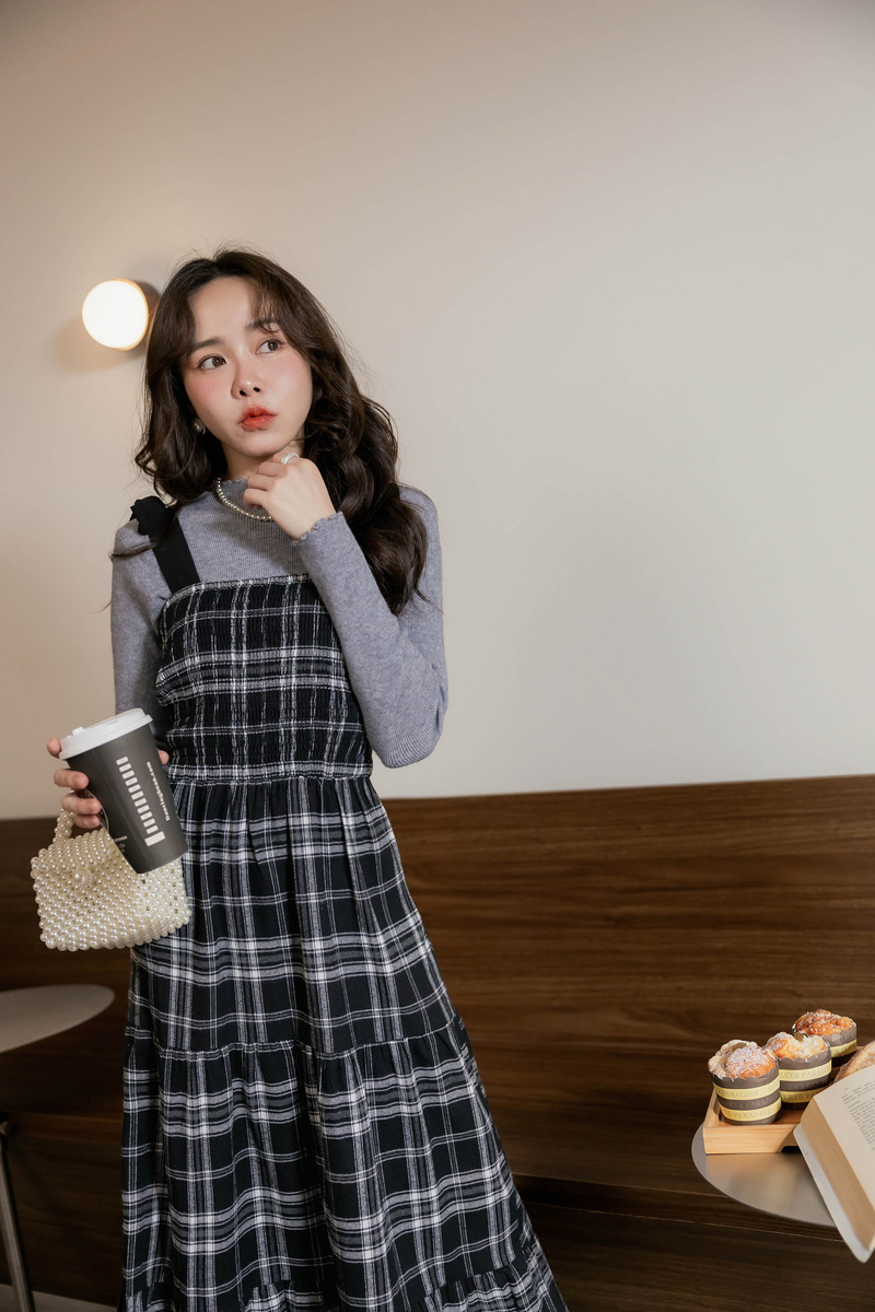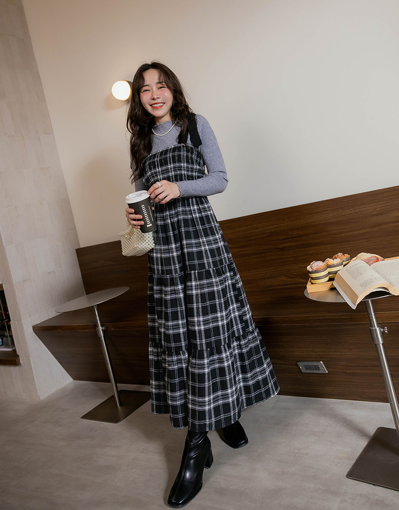 日系綁帶磨毛格紋蛋糕洋裝
