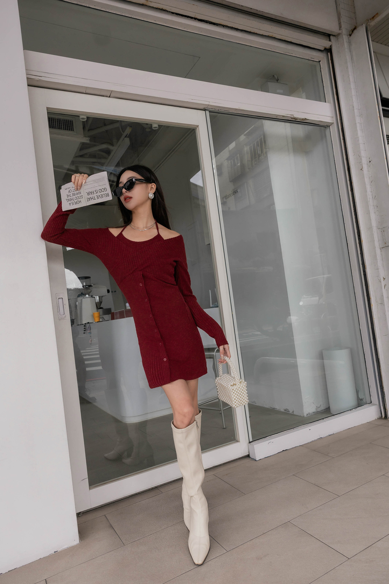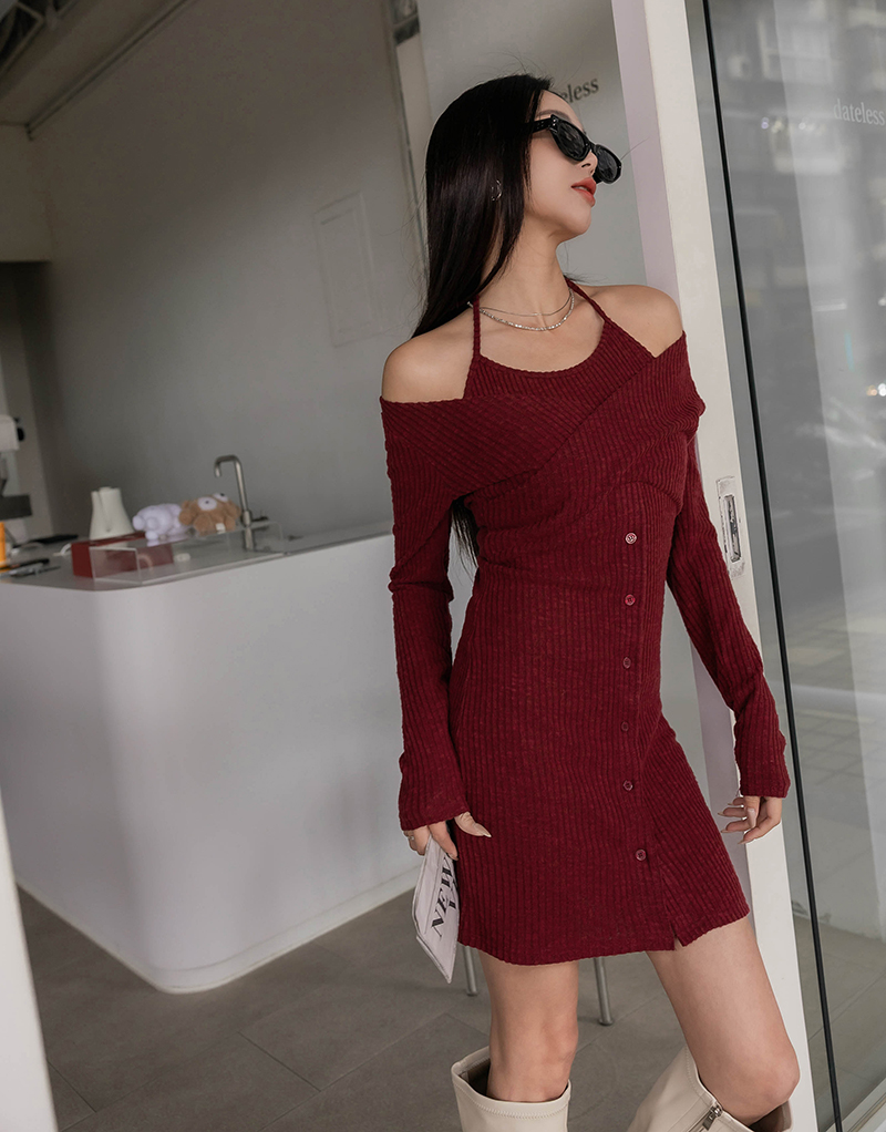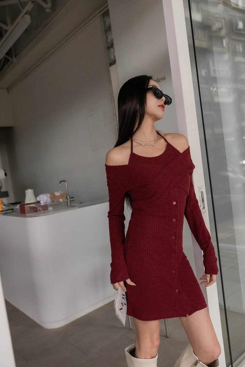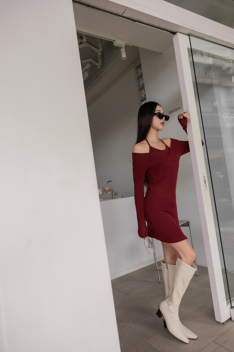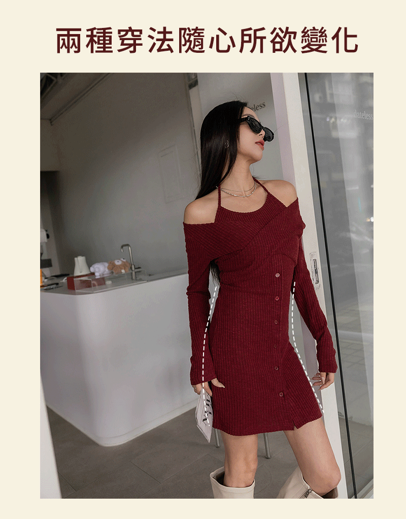 • 假兩件曲線感後開岔微絨洋裝
