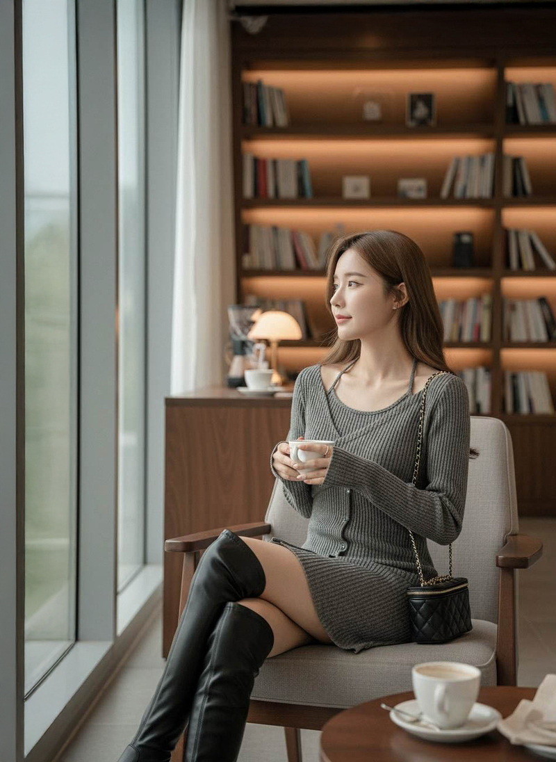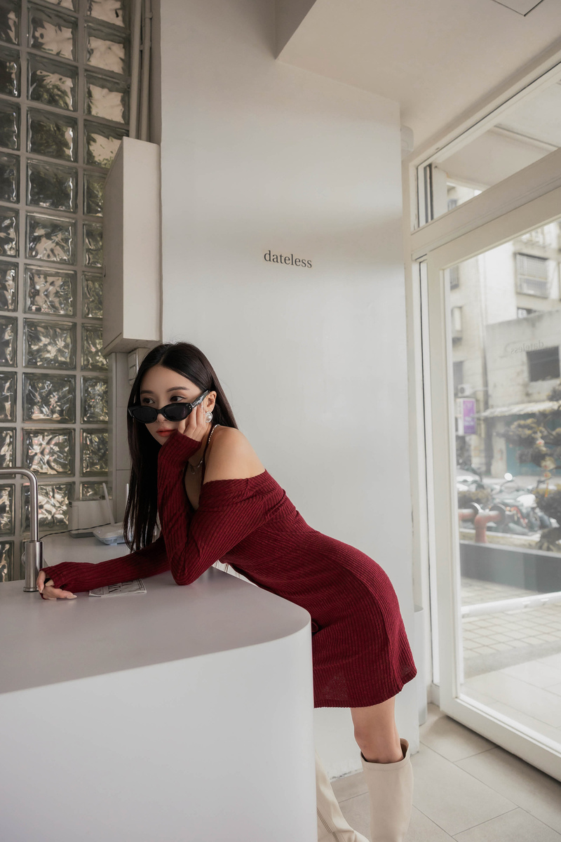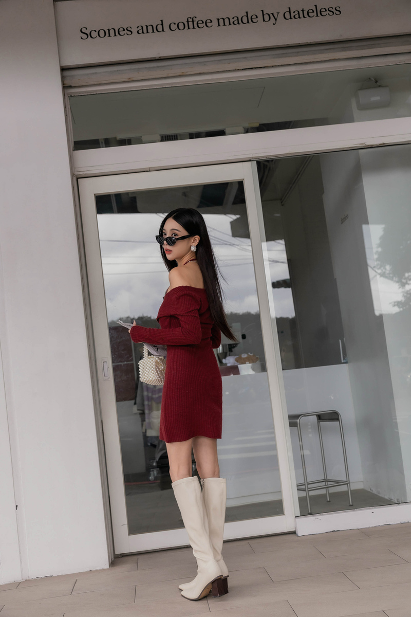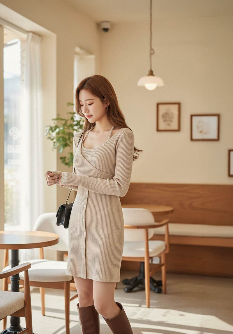 • 假兩件曲線感後開岔微絨洋裝