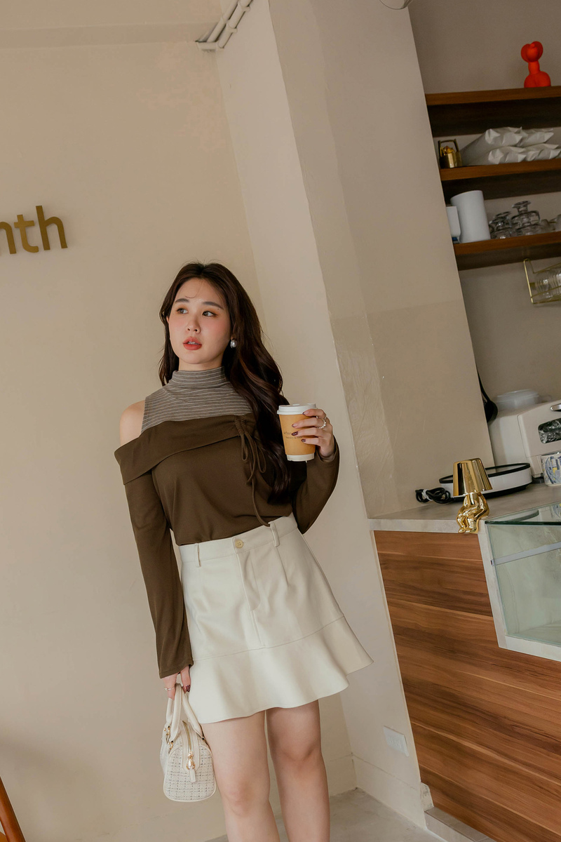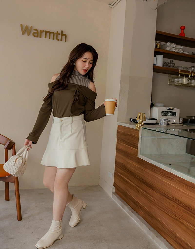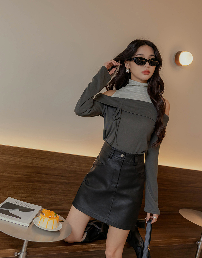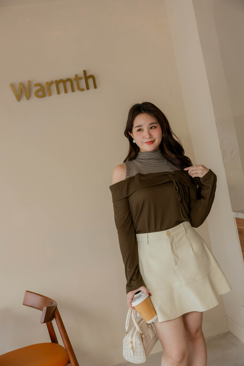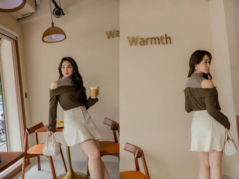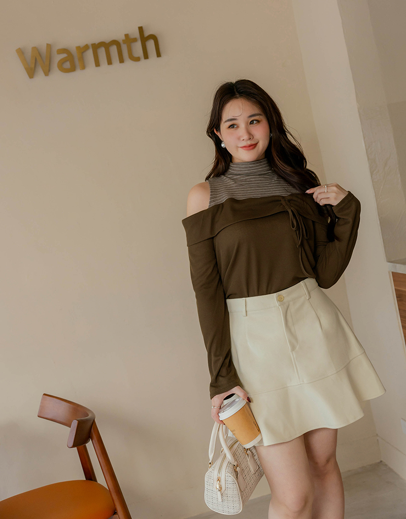 挖肩抽繩綁帶條紋高領上衣