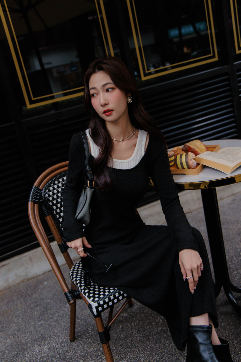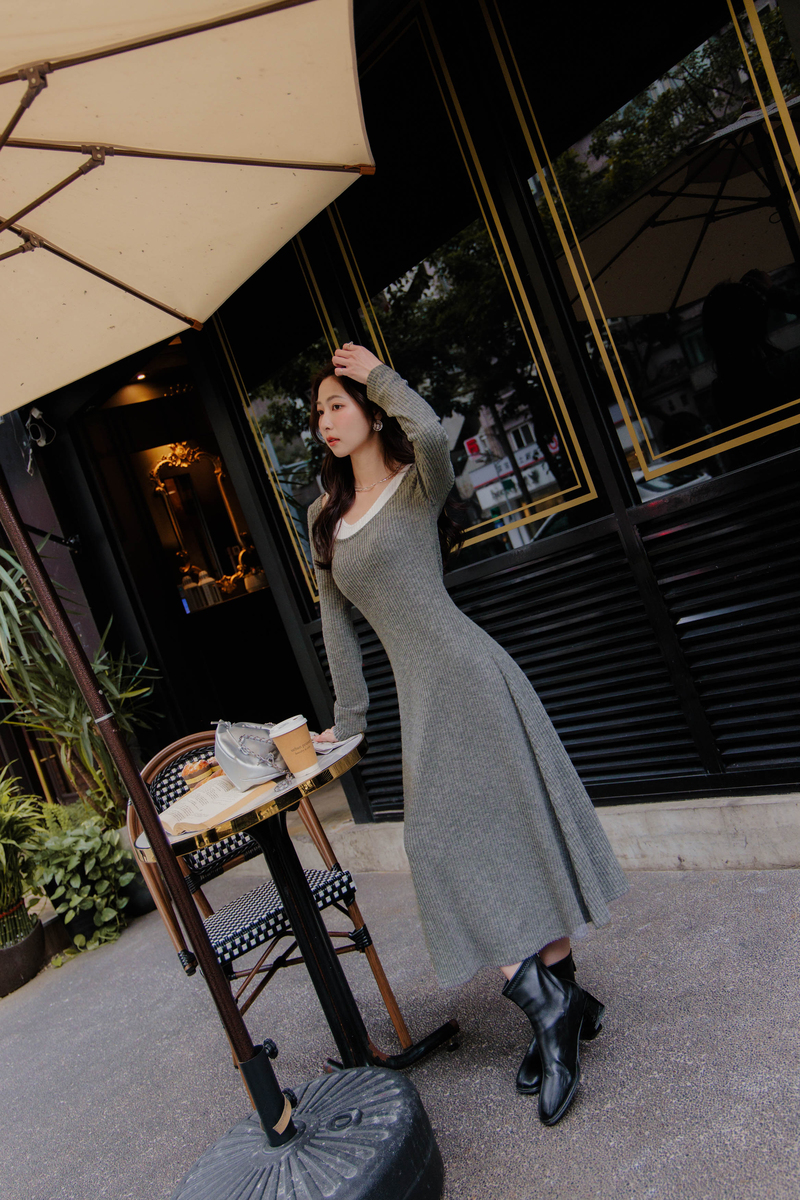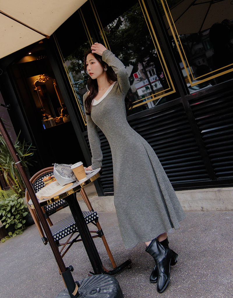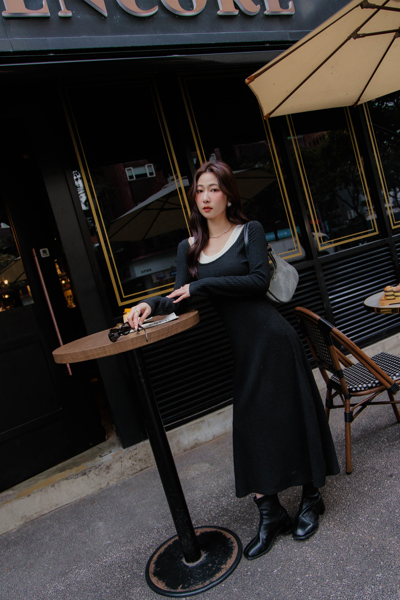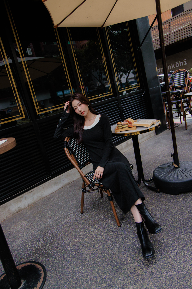 • 假兩件曲線感後開岔微絨洋裝