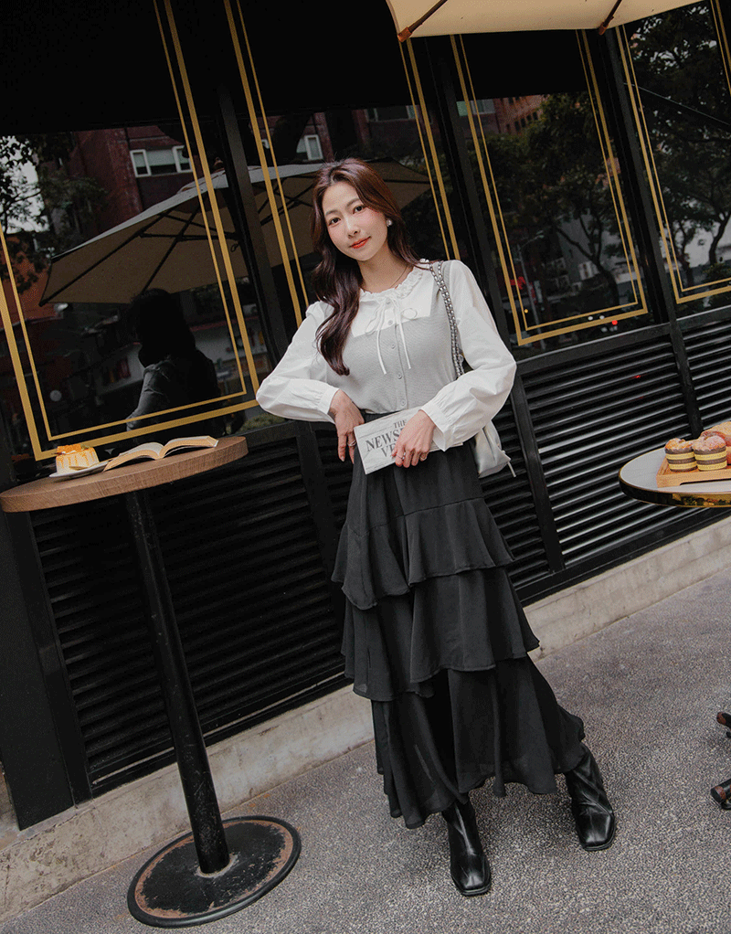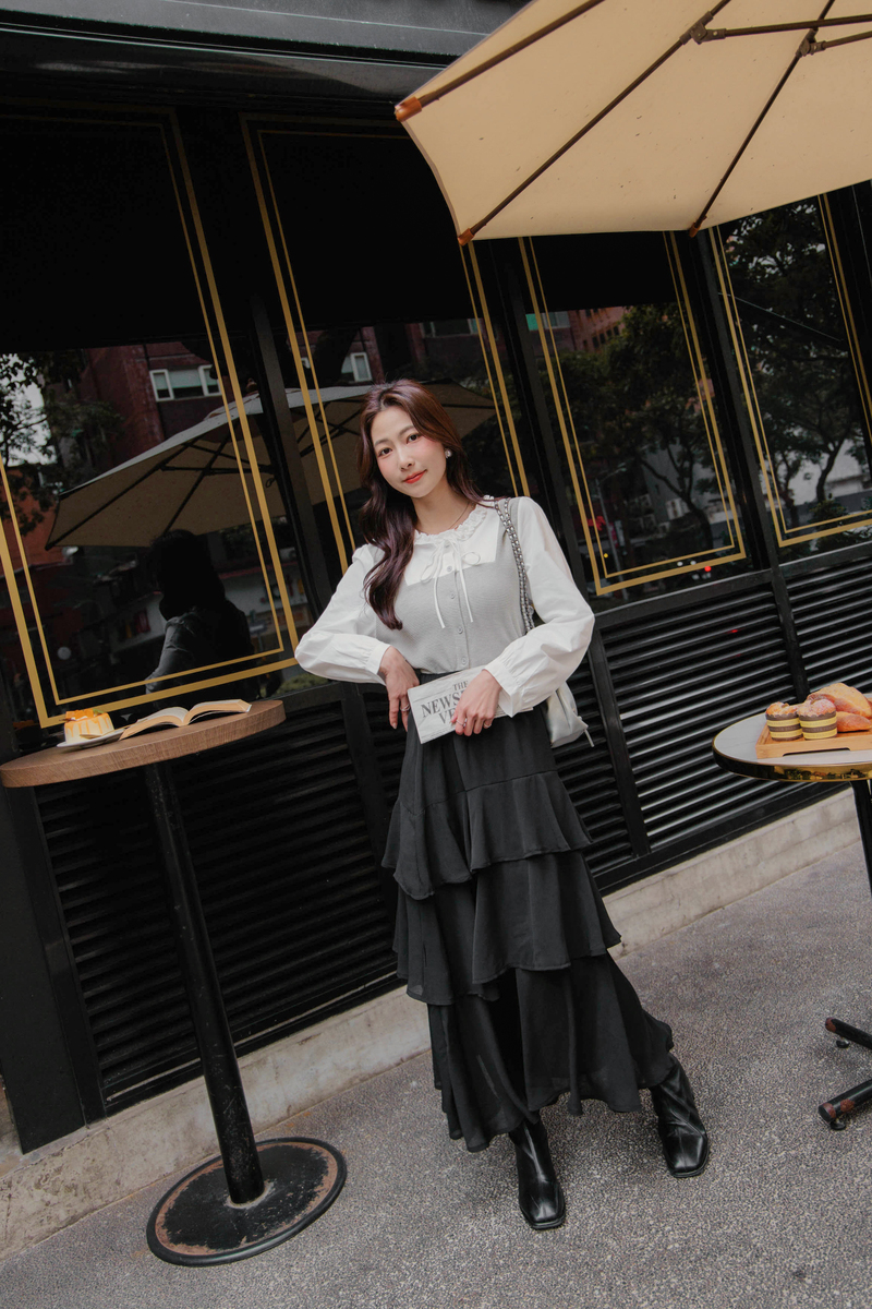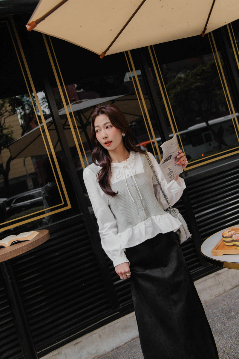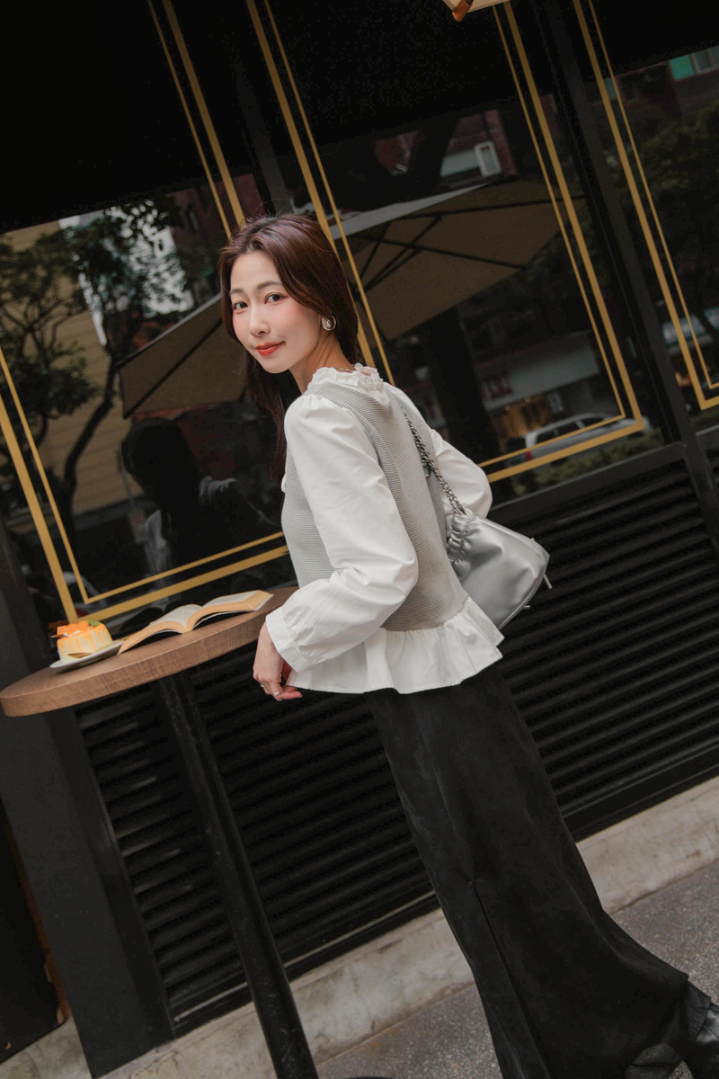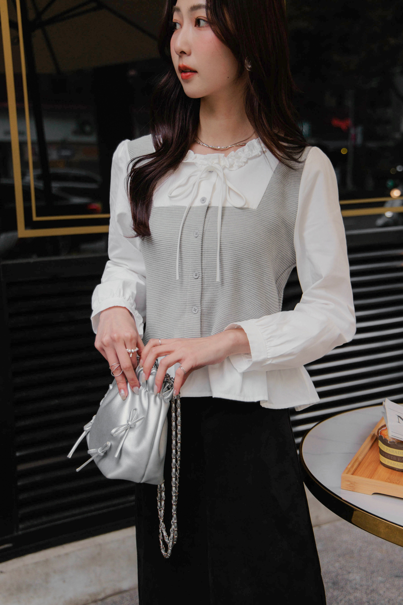 假兩件異材質擠花綁帶上衣