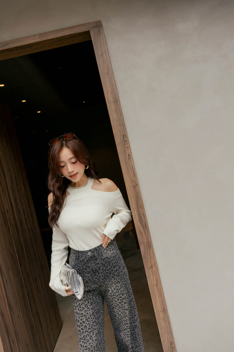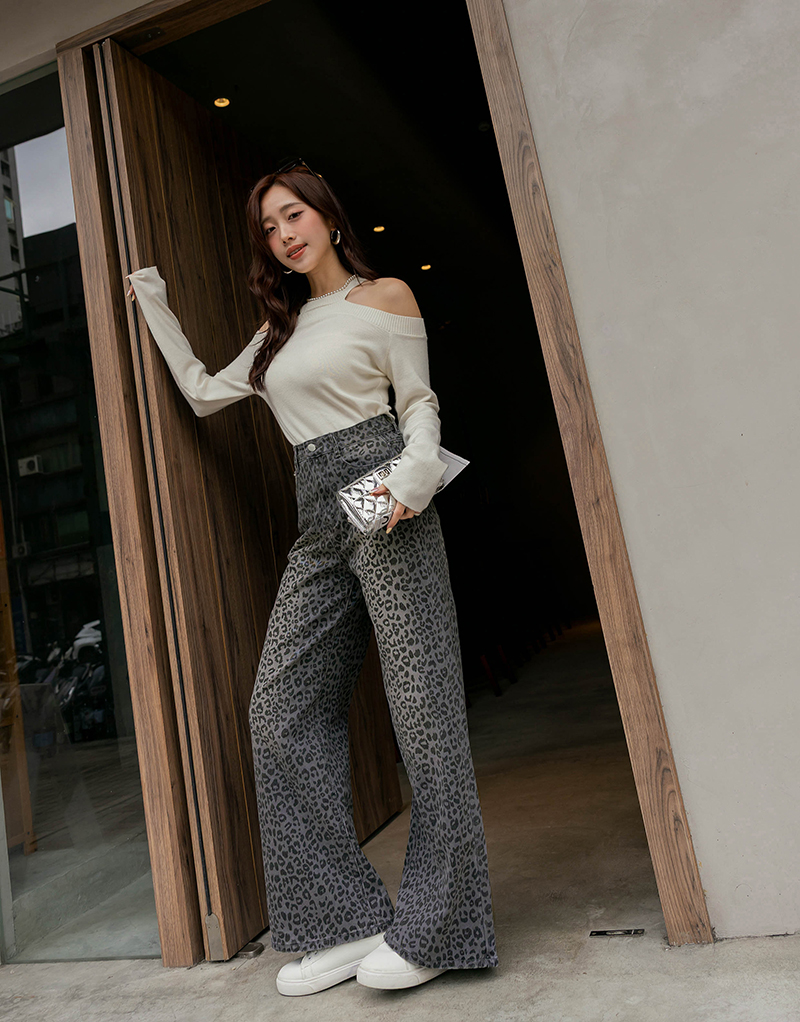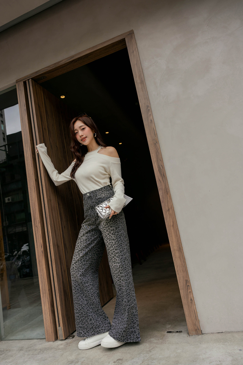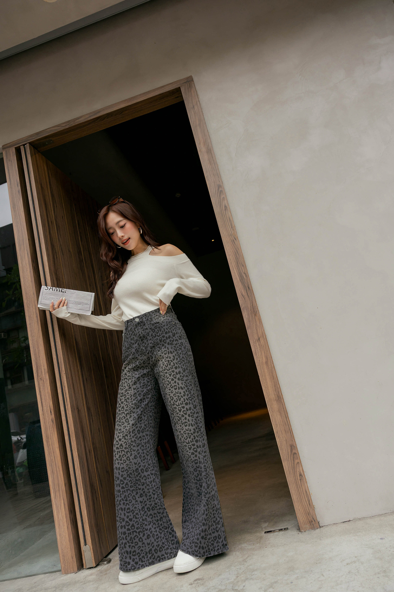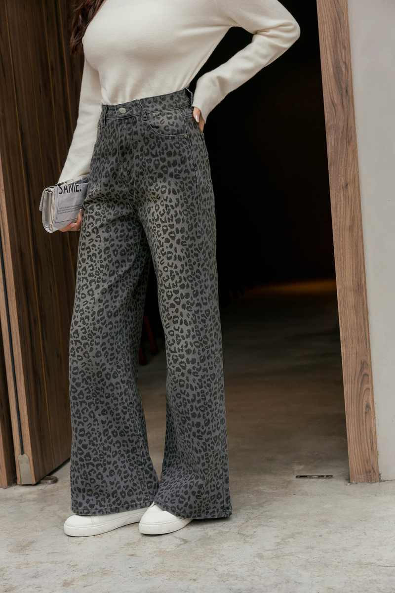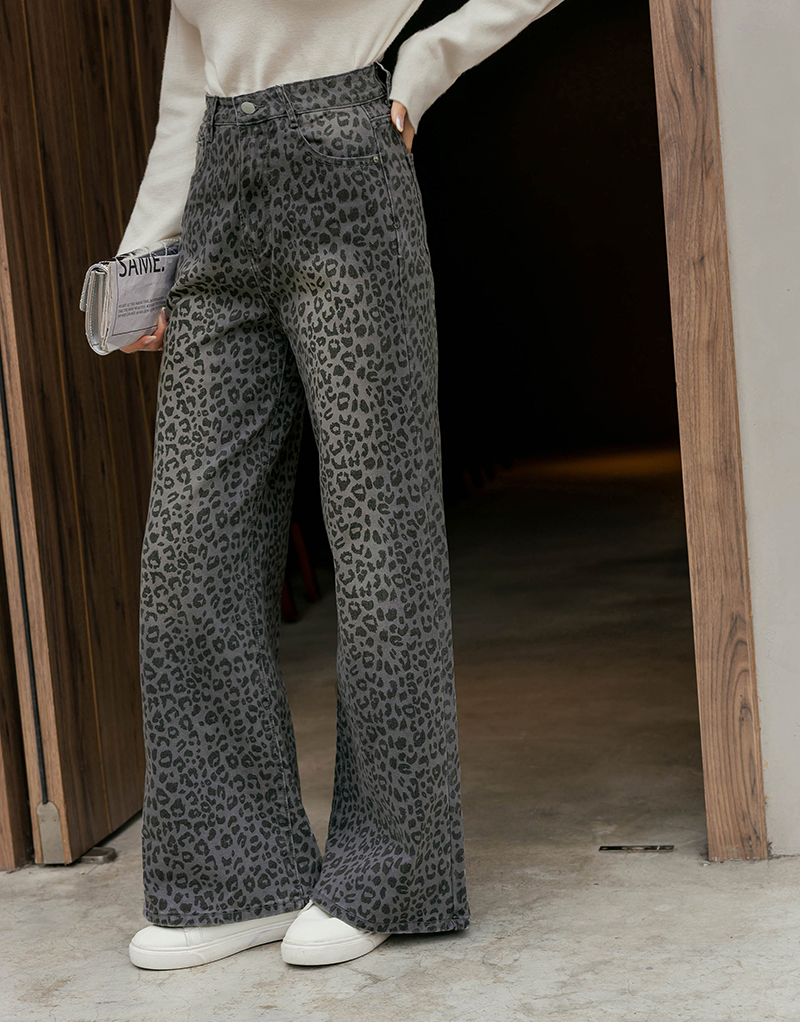 -5KG低調時髦豹紋刷白牛仔寬褲