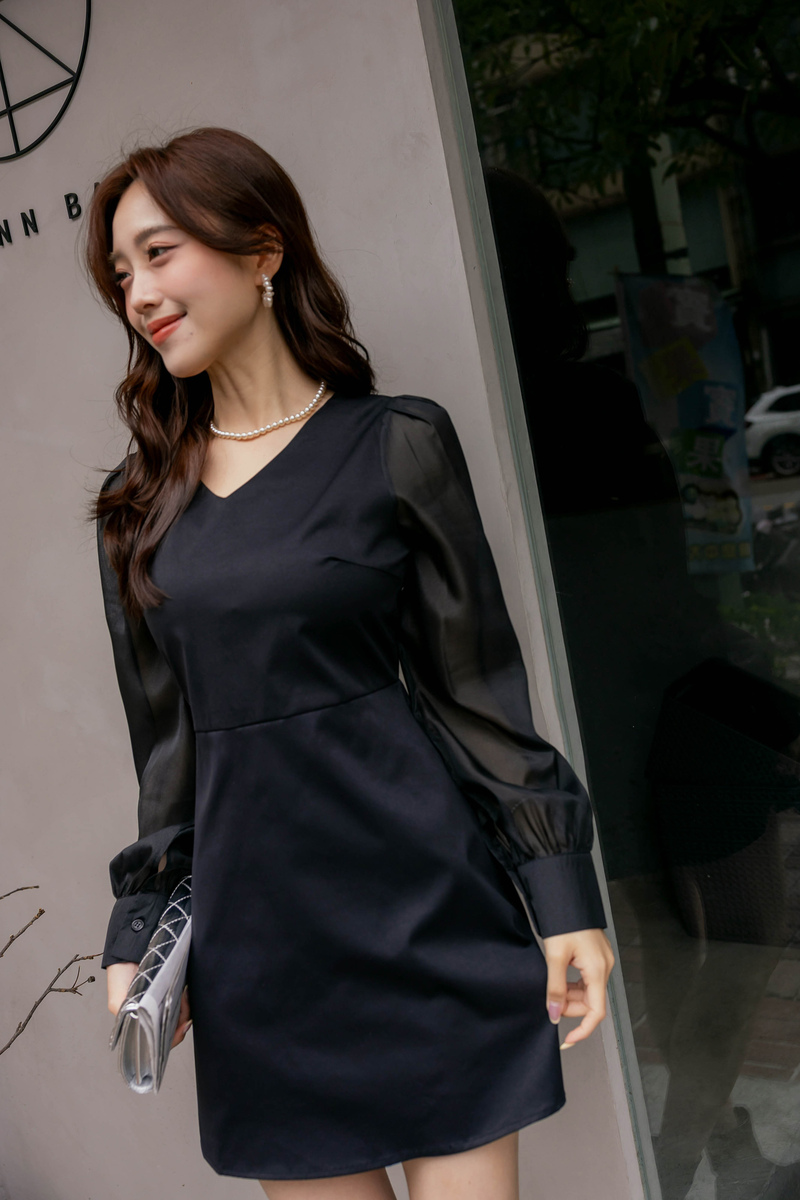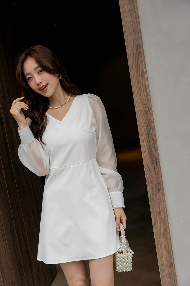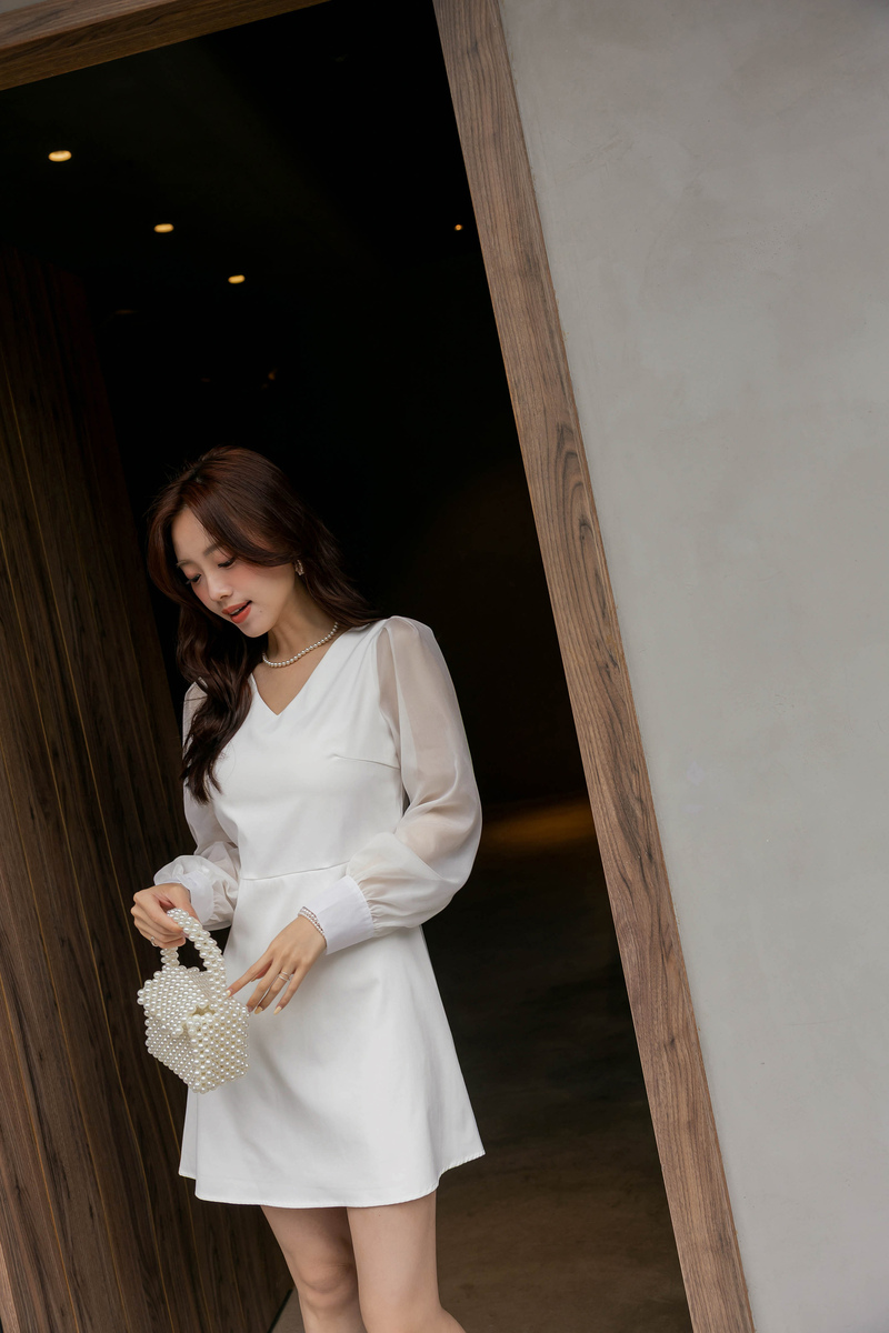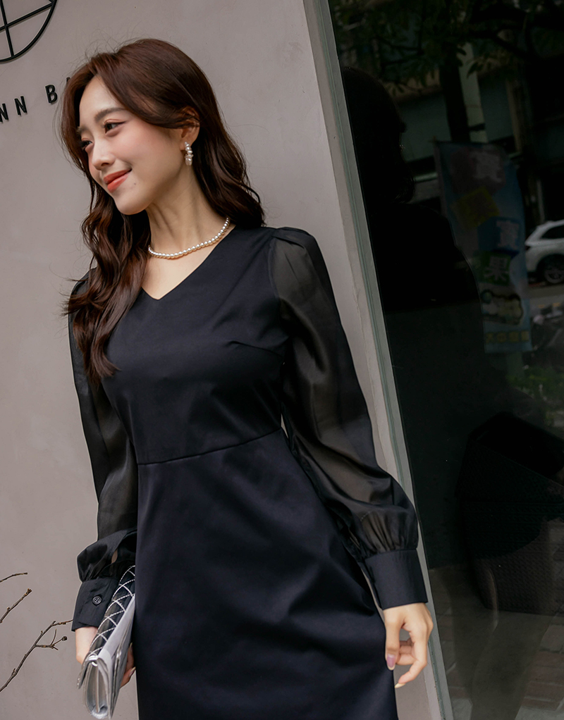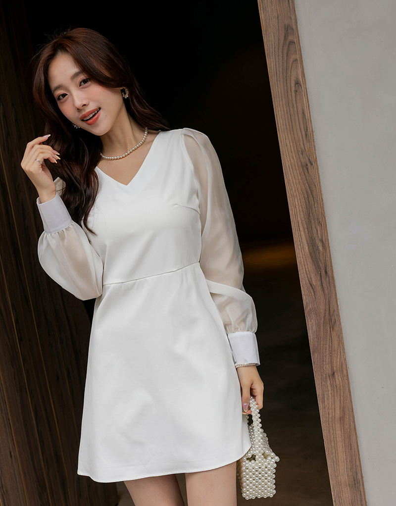 溫柔V領透膚珠光袖洋裝