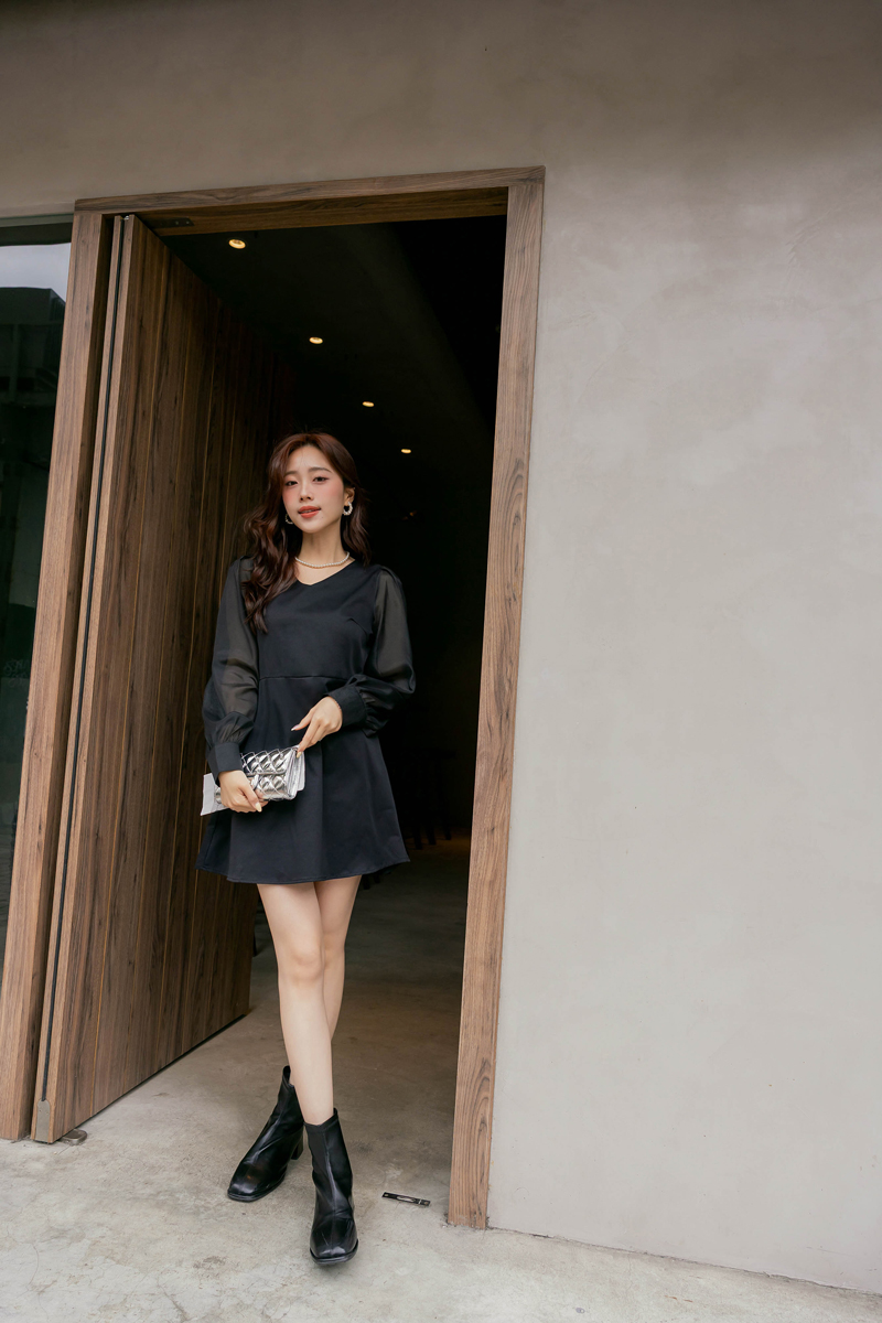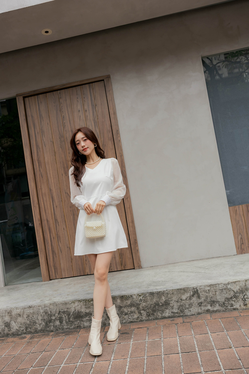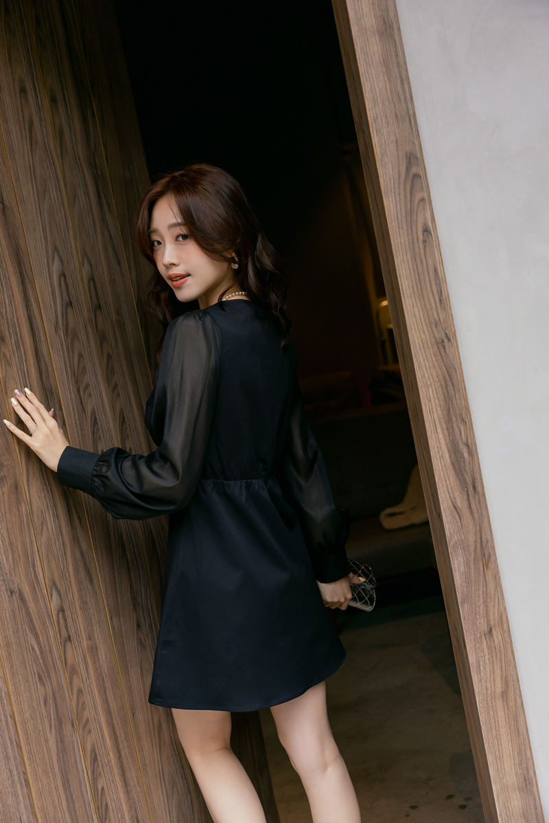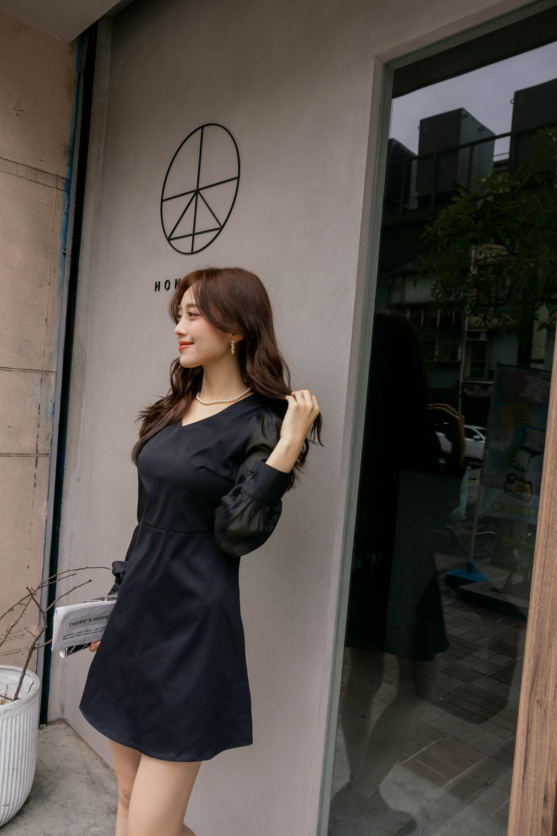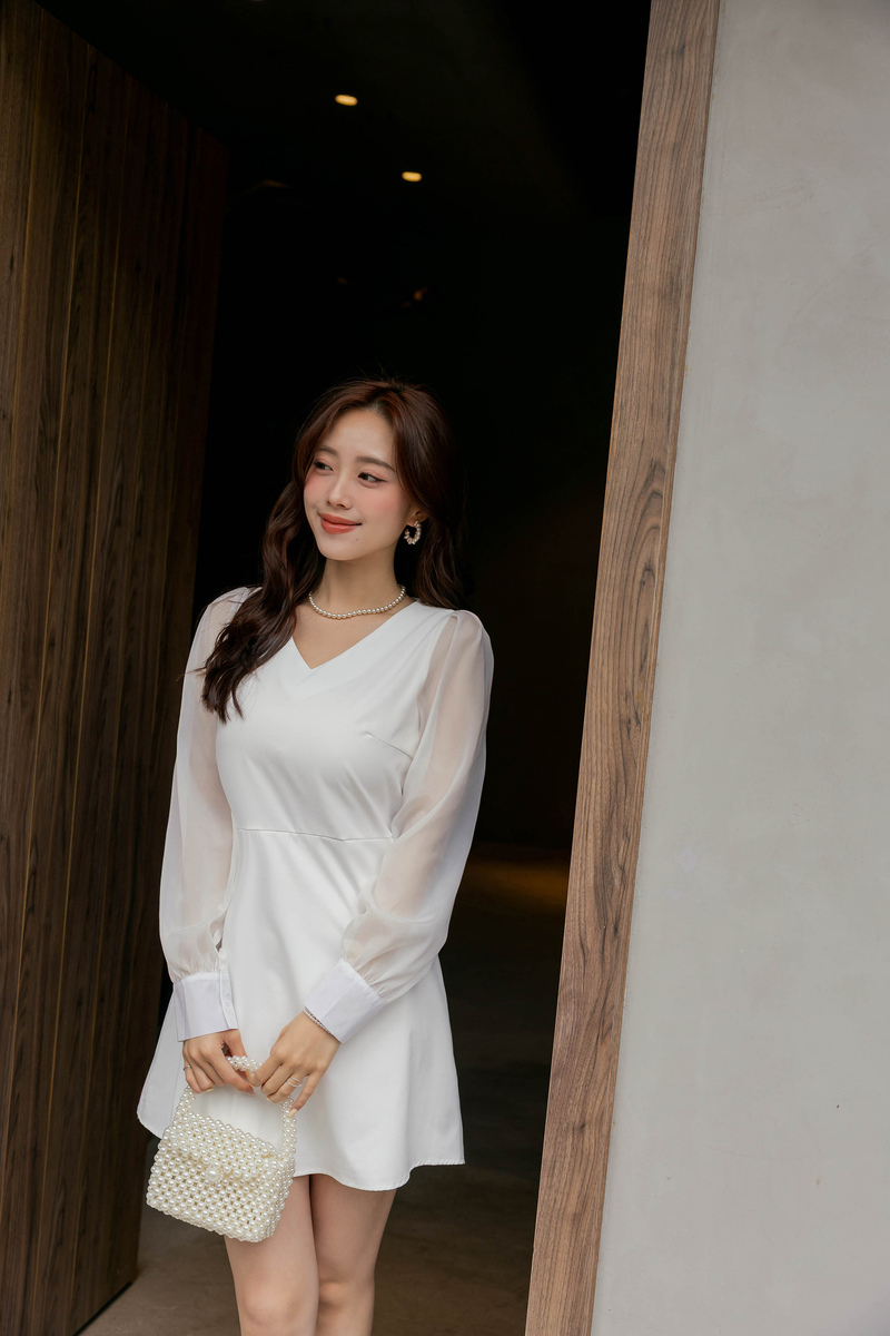 溫柔V領透膚珠光袖洋裝