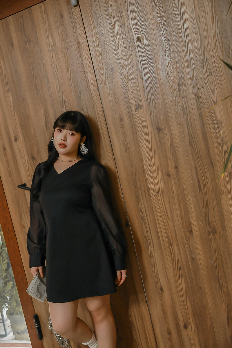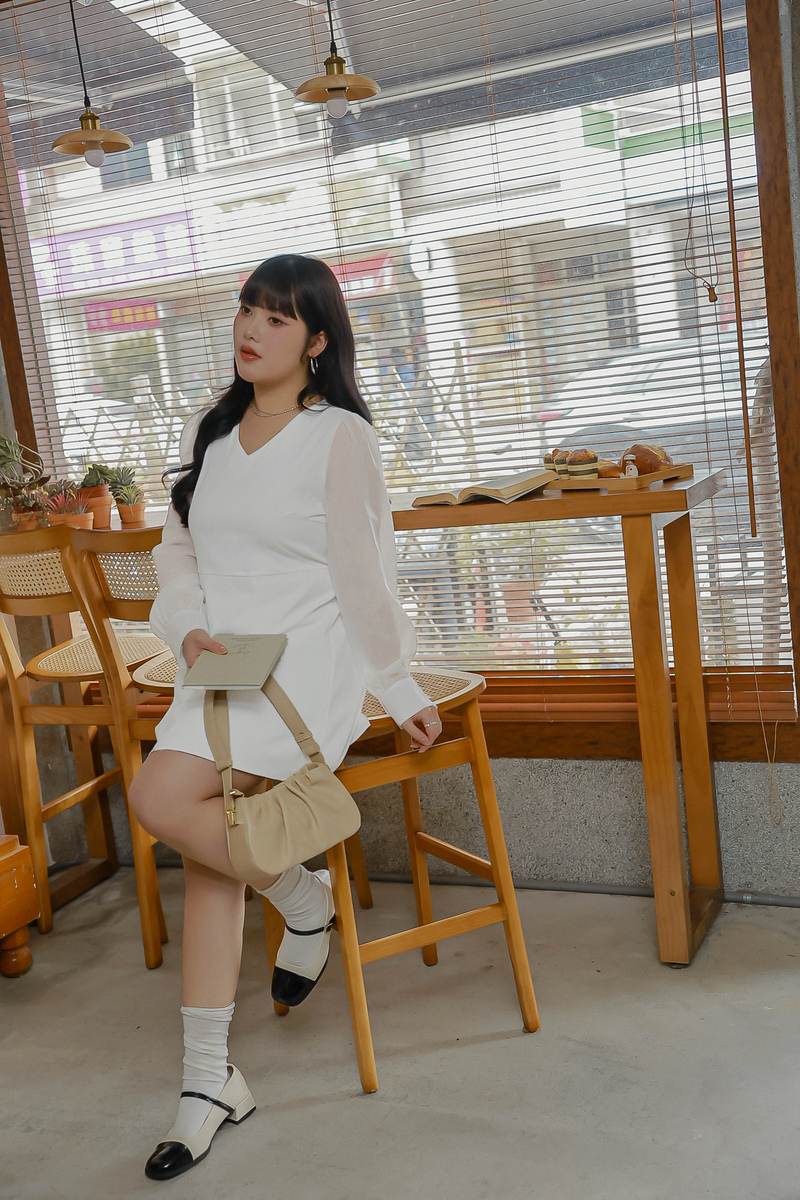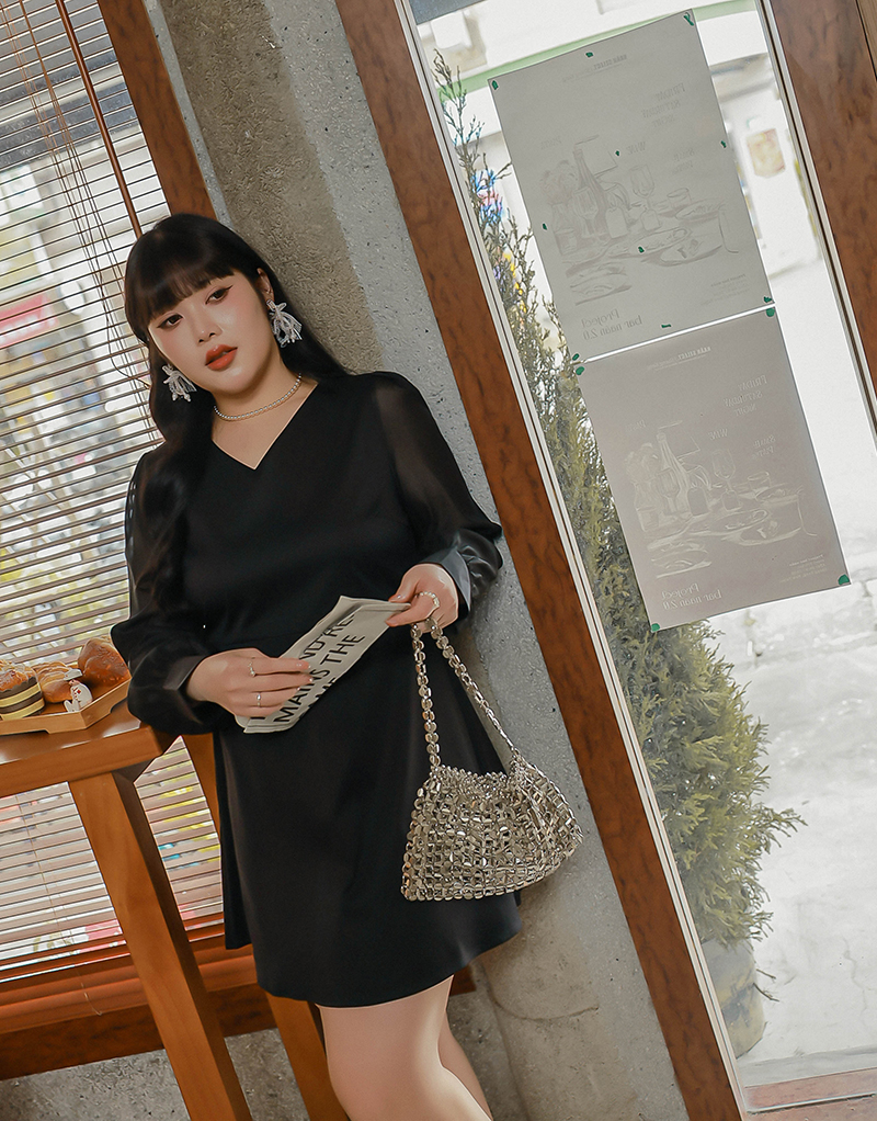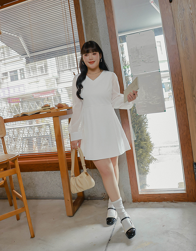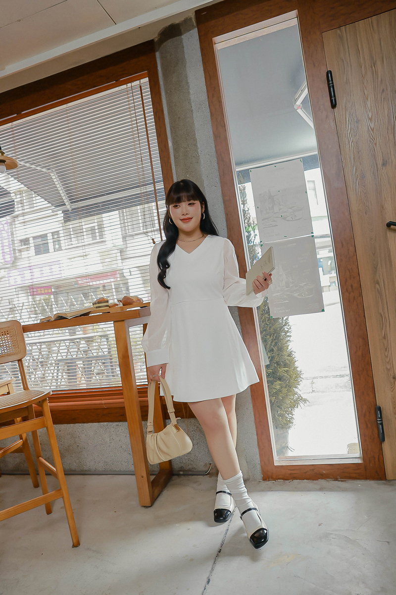 溫柔V領透膚珠光袖洋裝