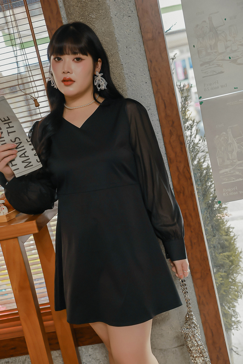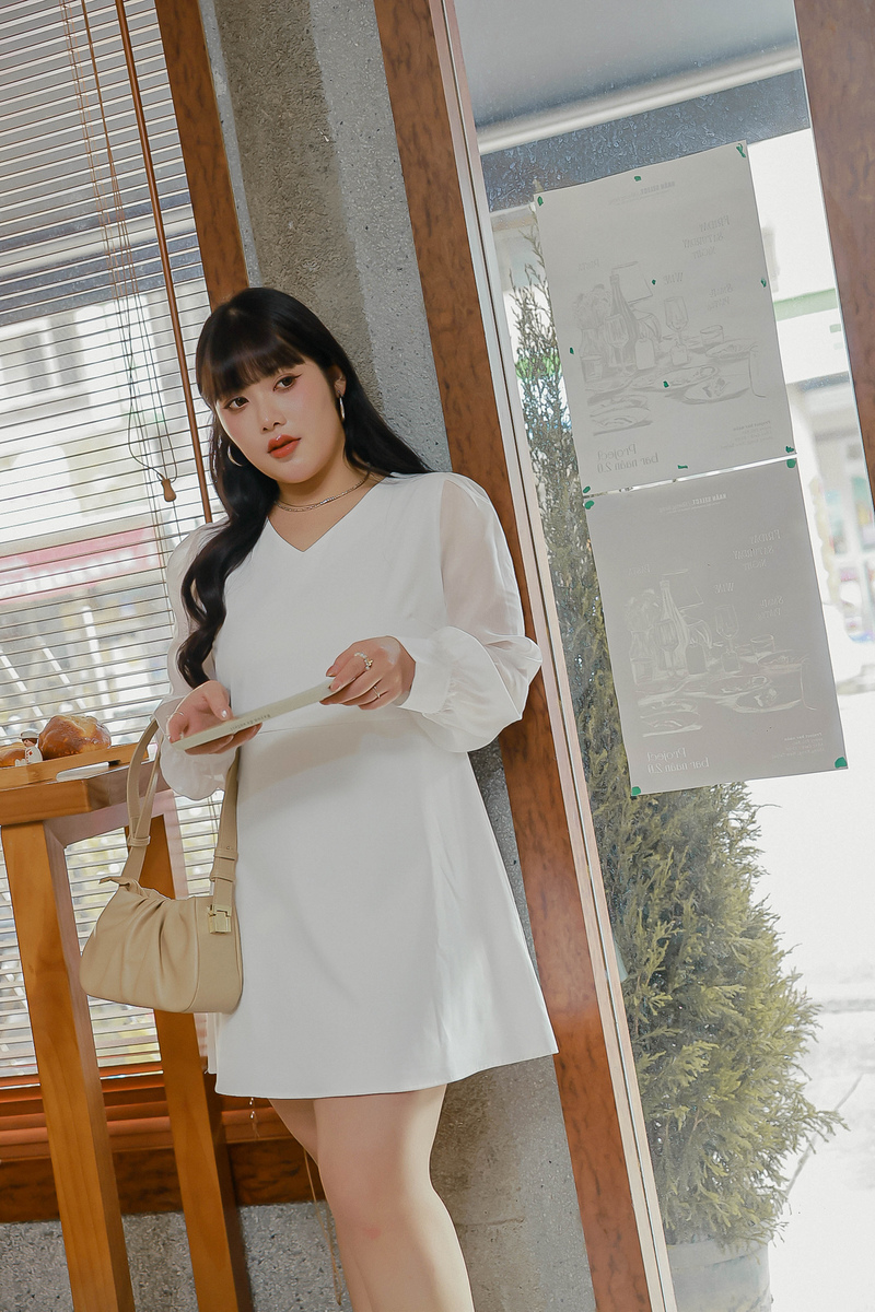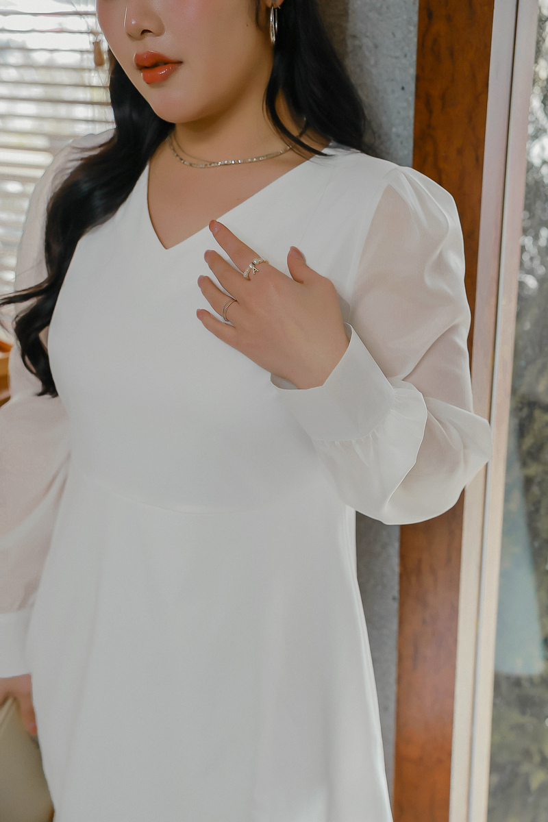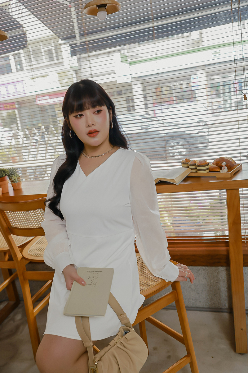 溫柔V領透膚珠光袖洋裝