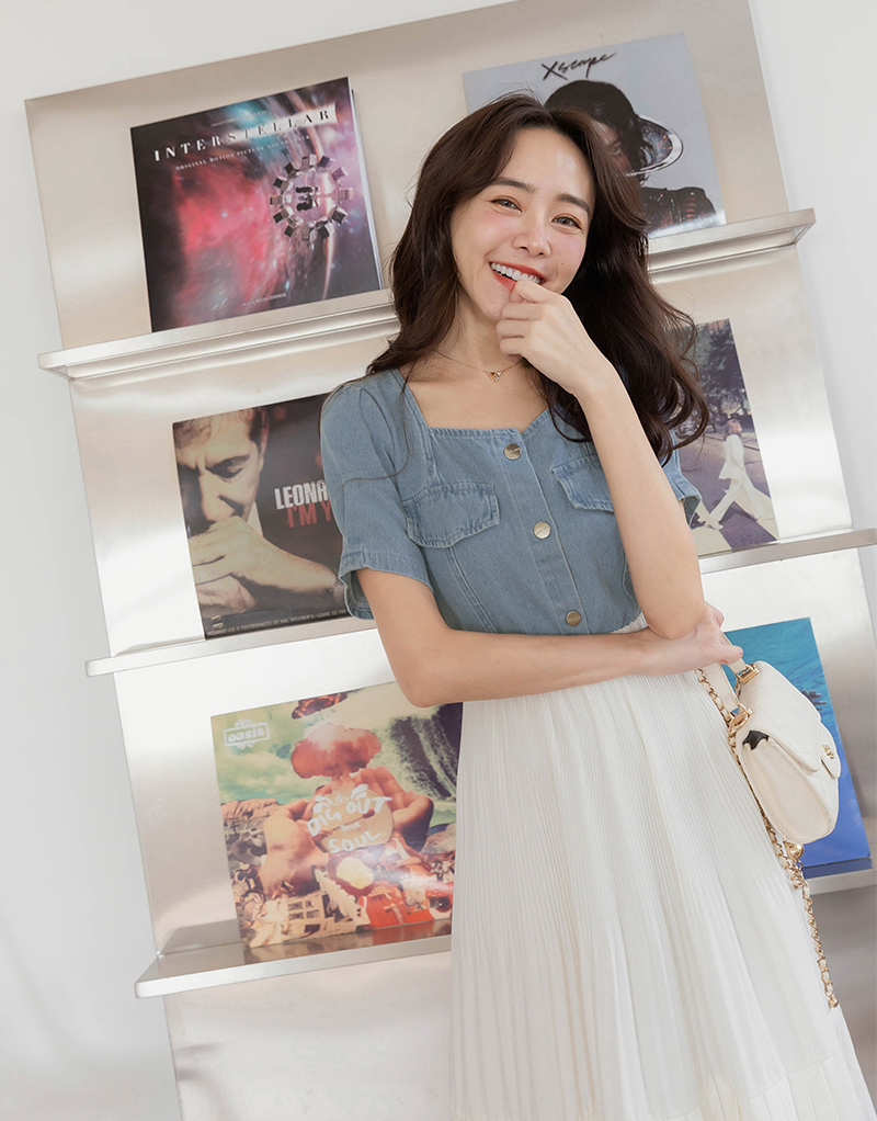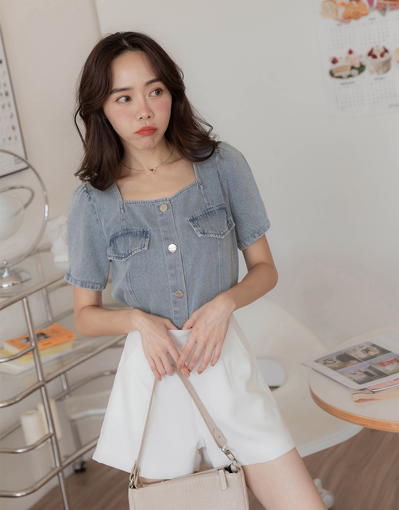 可愛袖壓褶牛仔上衣