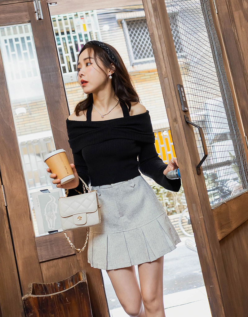 小香風後鬆緊壓褶褲裙