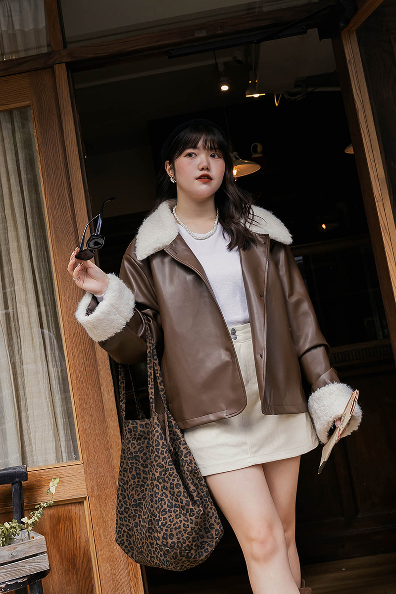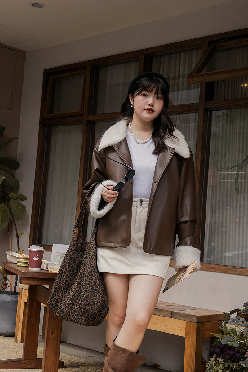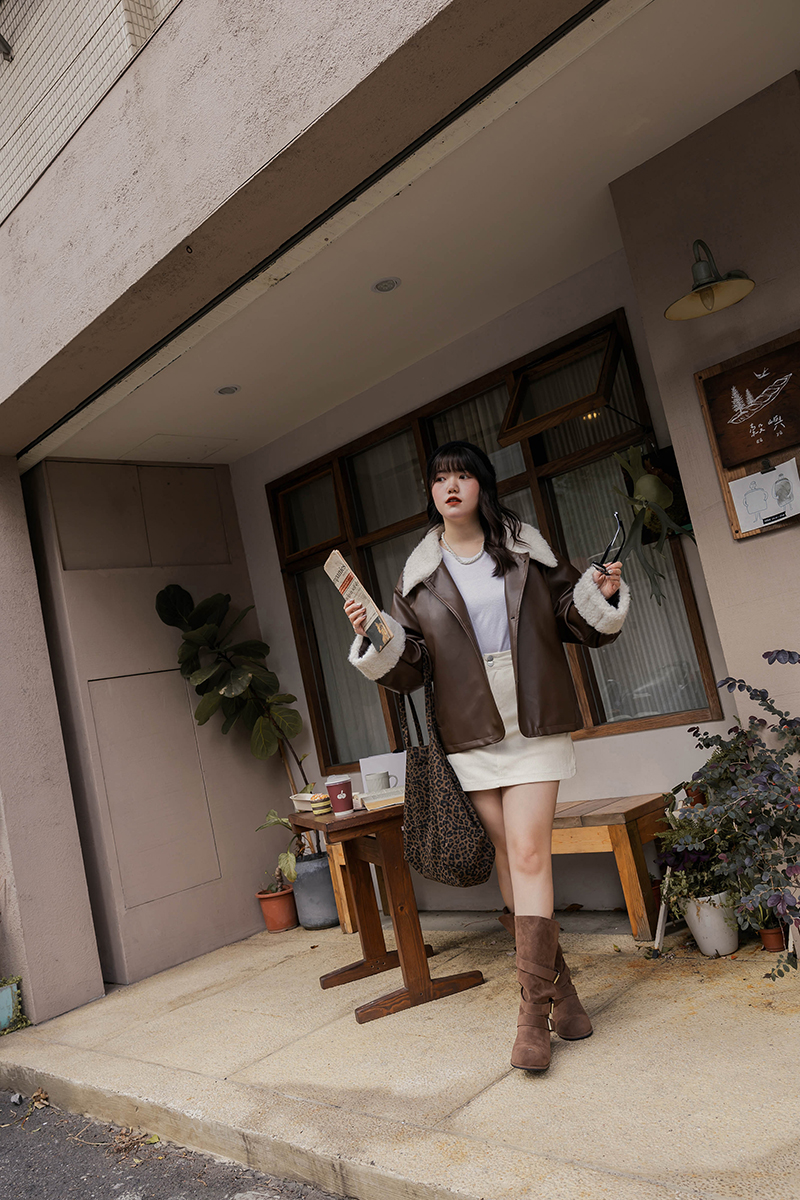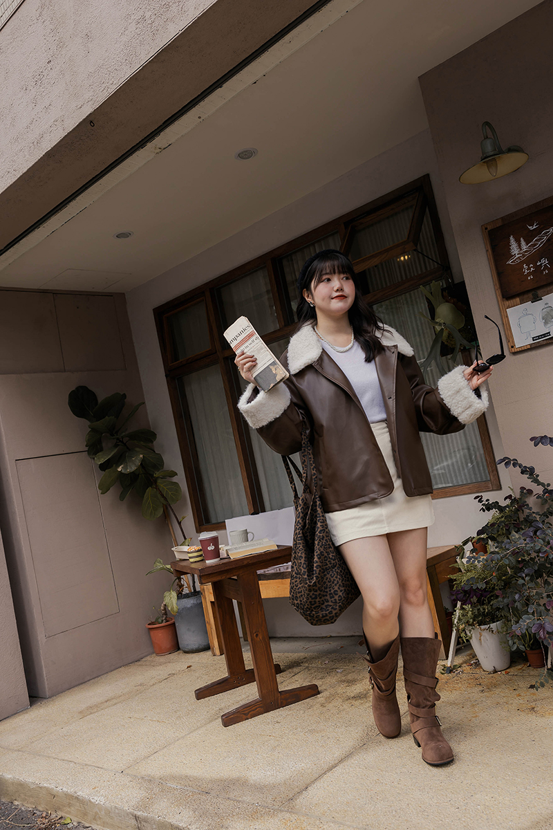 • 鋪棉皮質QQ毛撞色外套
