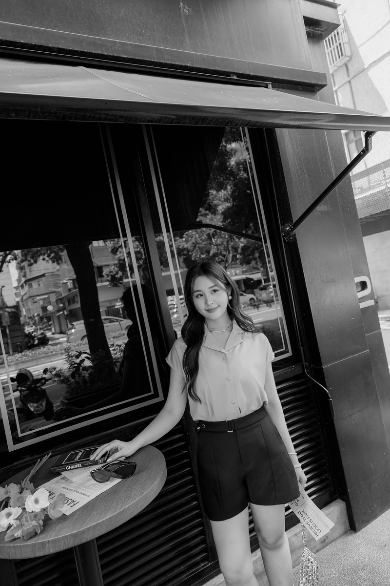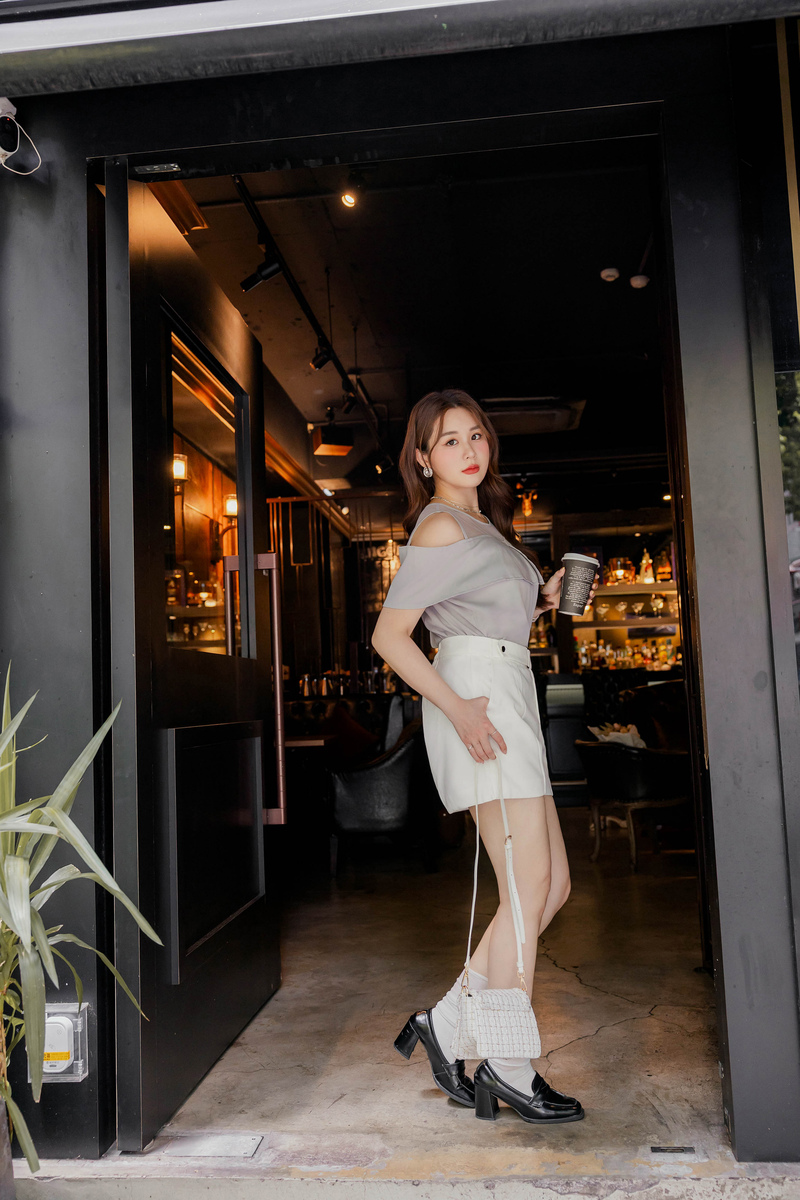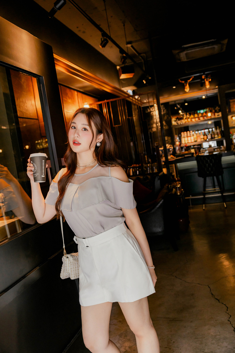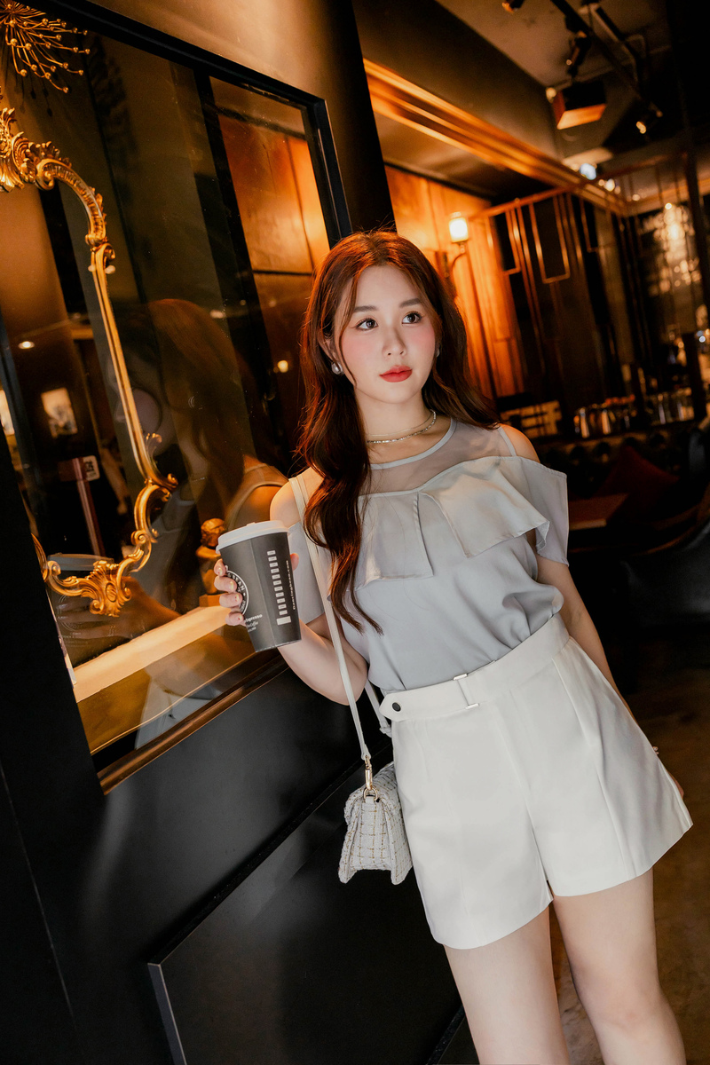 • 溫柔挖肩透膚翻領雪紡上衣