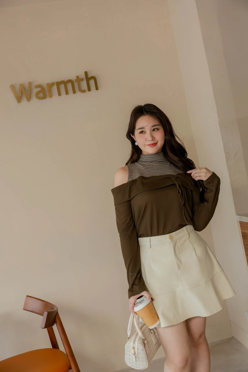 假兩件-挖肩條紋高領上衣