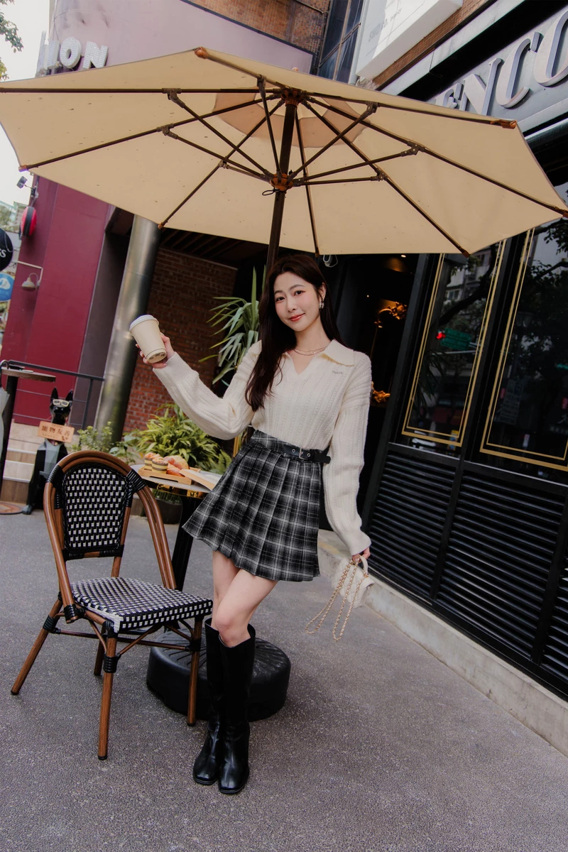 造型皮帶毛呢格紋壓摺褲裙