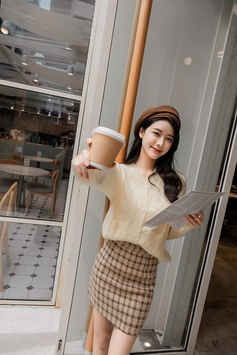 後拉鍊撞色毛呢格紋褲裙