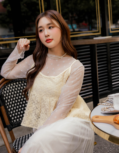 小香風方領星空釦透膚袖上衣