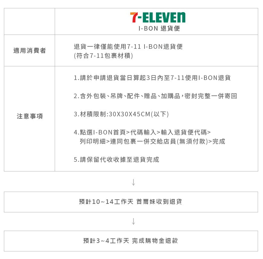 .取貨後如有不適合的商品,請於7日鑑賞期內(計算起日即簽收日,包含社區管理員/親友代收簽收)於會員登入→至「訂單查詢」頁面,按下「退貨」→填上退貨原因及退貨超商類型(7-11)→至「訂單查詢」頁面,點選「查看」,寫下退貨代碼前往超商退貨(若超過期效,將無法提供第二組)。