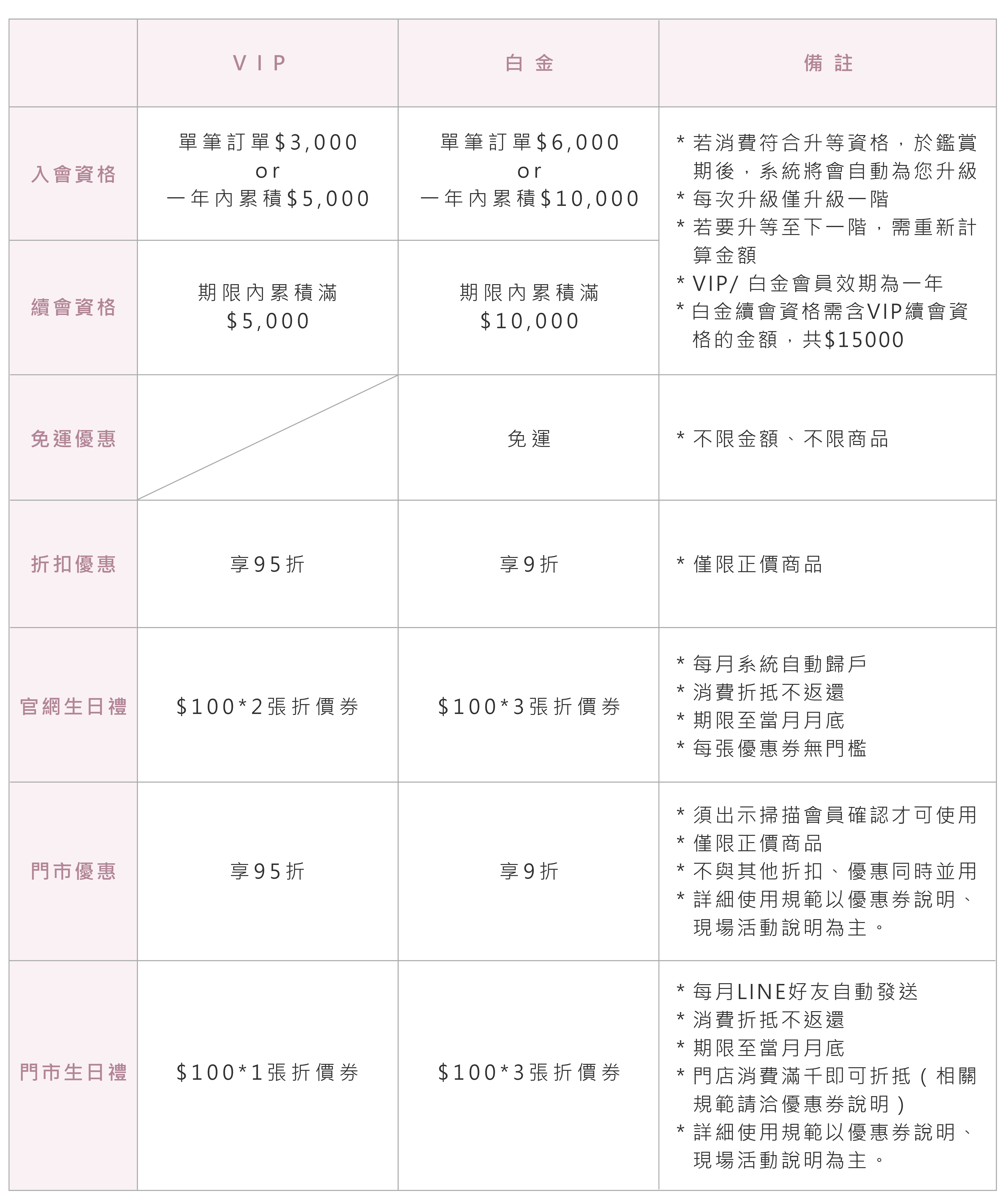 1. 升等資格為1項金額資格計算為主。例:一般會員單筆消費滿3000元或年消費滿5000元將升等為VIP,其會再升等之資格則以0元開始計算;即若要升等成白金會員需再單筆消費6000元或年累積消費10000元才可升等。 2. 若是月中升等為 VIP/ 白金,相關優惠將於下個月開始享有優惠。 3. 限同一帳號使用,同買家多帳號無法合併累積、轉移使用。 4. 提供多管道會員註冊,請留意註冊之EMAIL帳號不同、無法合併累積消費金額。